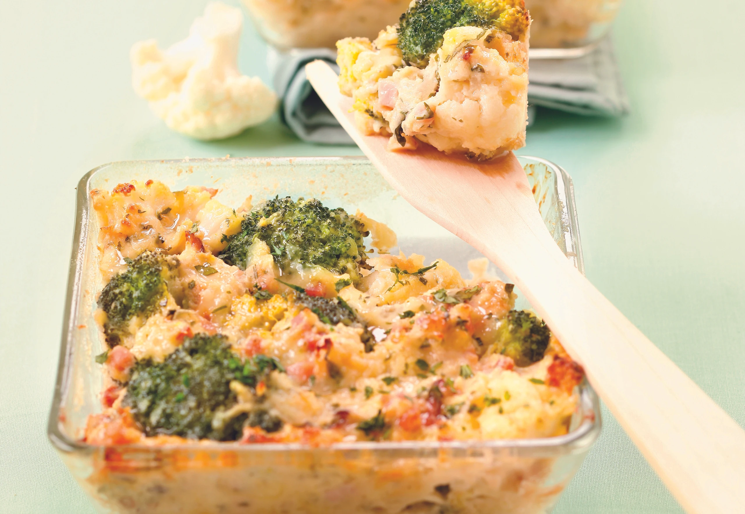 Brokkoli und Karfiol putzen, waschen, in Röschen teilen und in Salzwasser bissfest kochen. Abschrecken und abtropfen lassen. Zwiebel schälen und hacken. Schinken klein schneiden. Schinken, Zwiebel und Petersilie in Öl anbraten und in einem Sieb abtropfen lassen.