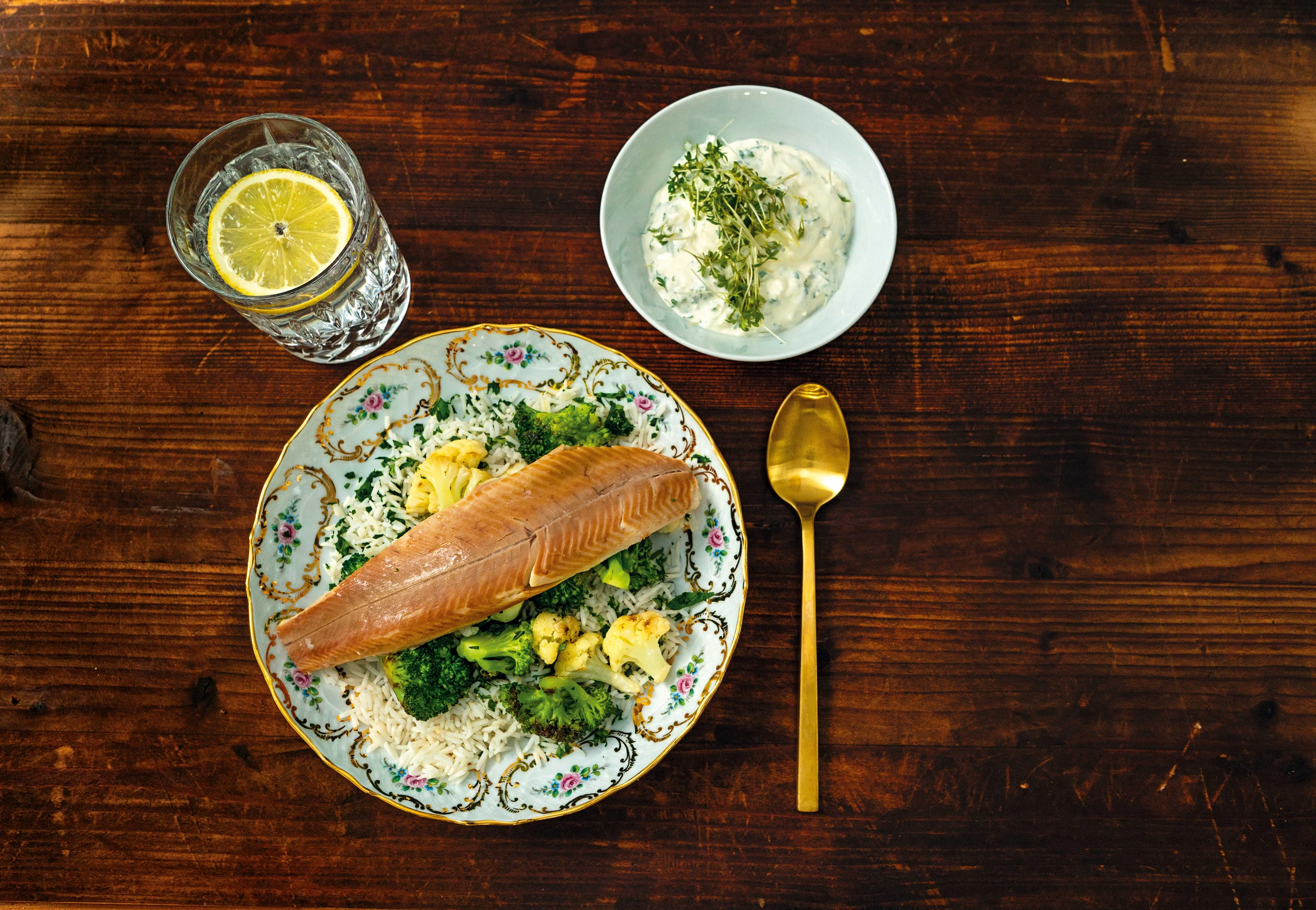 Brokkoli-Karfiolgemüse mit Räucherforelle und Kräuterreis