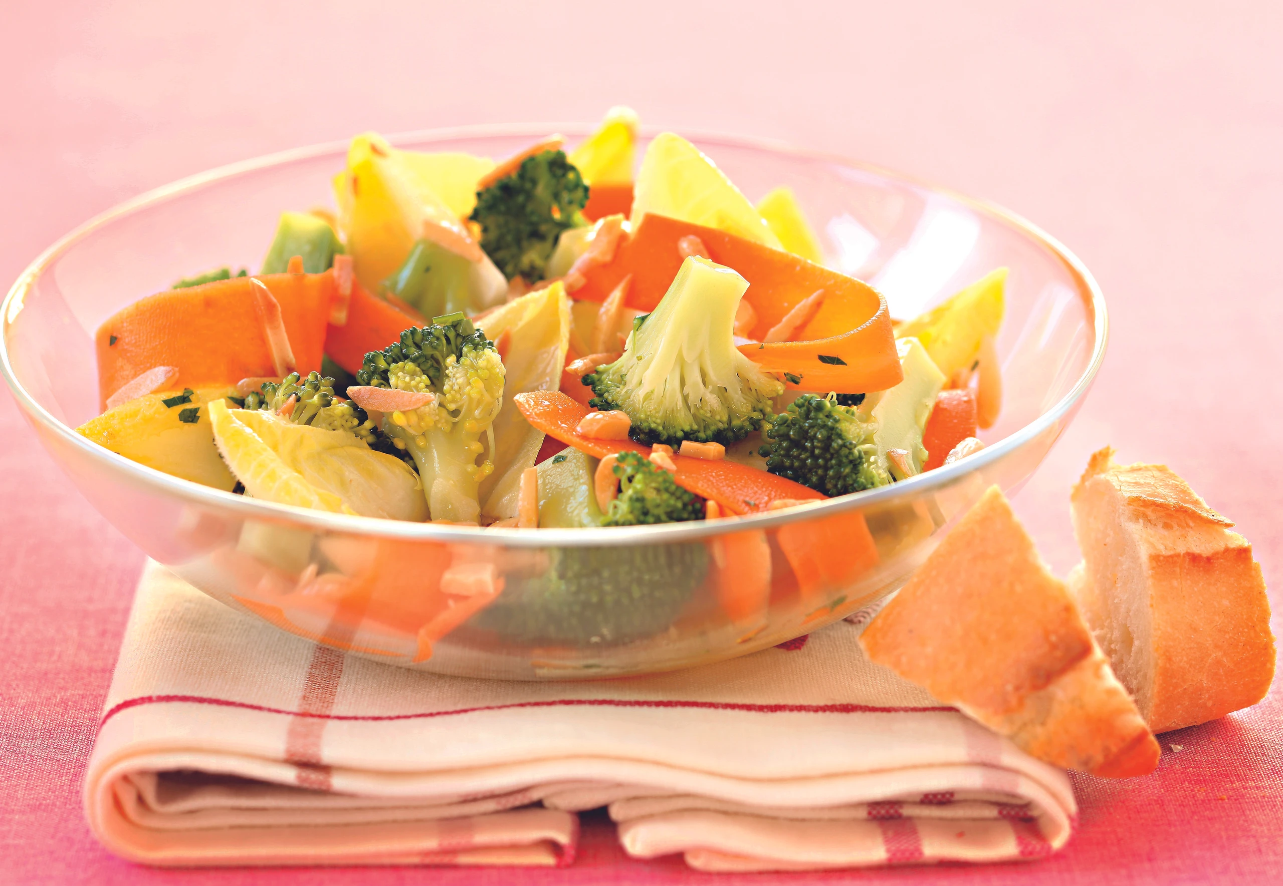 Für die Marinade Essig, Suppe, Mandeln, Petersilie, Salz und Pfeffer vermischen. Öl unter Rühren zugießen. Marinade mit dem Gemüse vermischen und kurz ziehen lassen. Salat mit Baguette oder dunklem Brot servieren.
