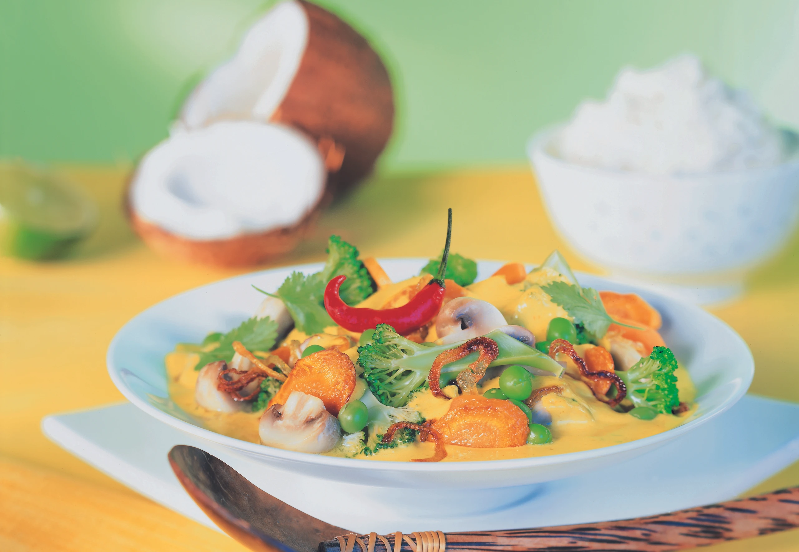 Brokkoli, Karotten und Pilze in Kokos-Curry-Sauce