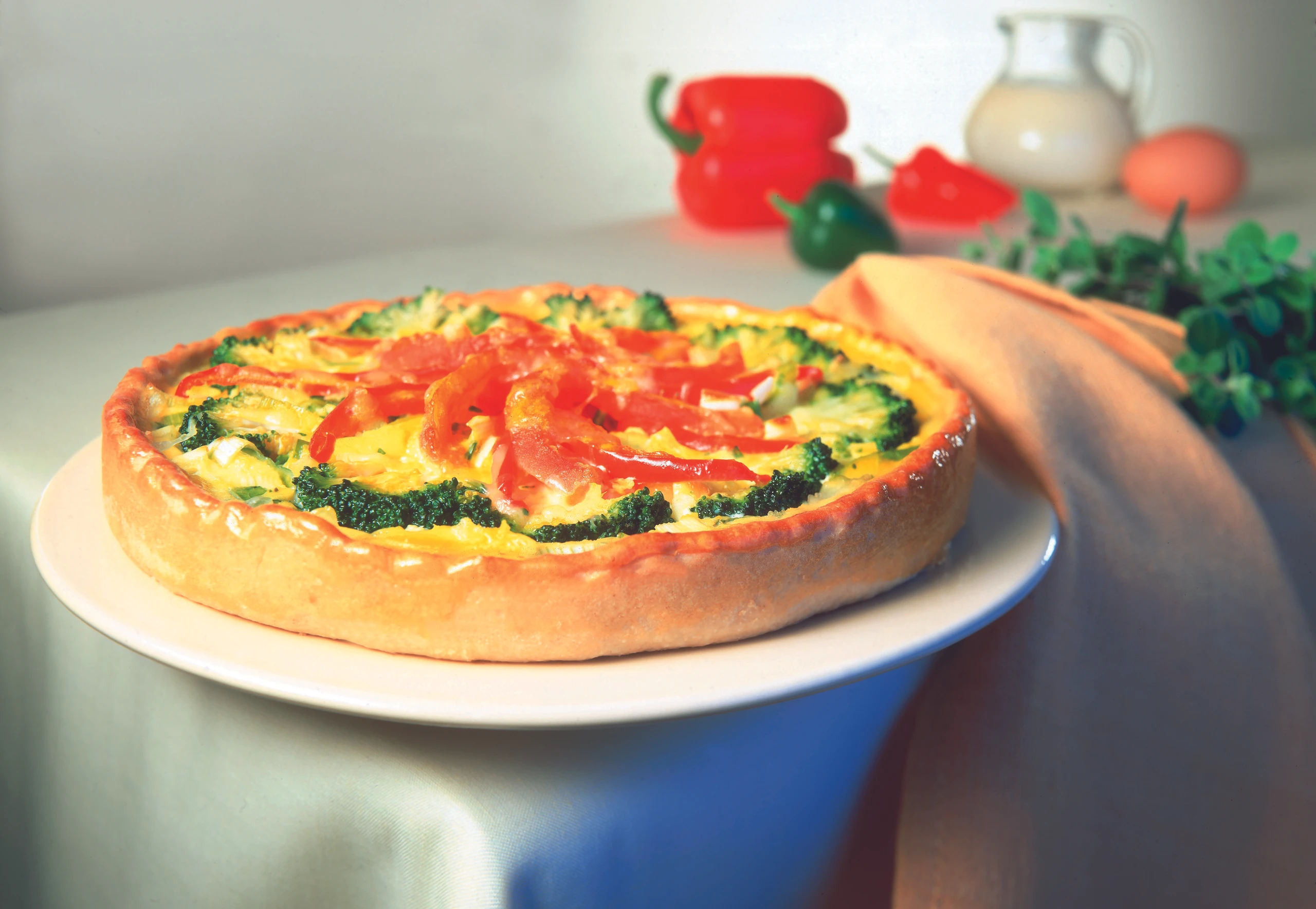 Lauch und Brokkoli in der Form verteilen und mit der Joghurt-Eiermischung übergießen. Tarte mit Paprika- und Paradeiserstreifen belegen und mit Käse bestreuen. Tarte im vorgeheizten Rohr (mittlere Schiene / Gitterrost) ca. 30 Minuten backen.