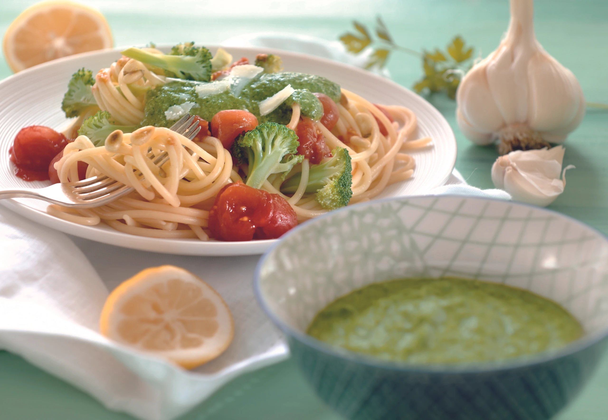 Brokkoli-Pasta mit Petersilpesto und Paradeisern