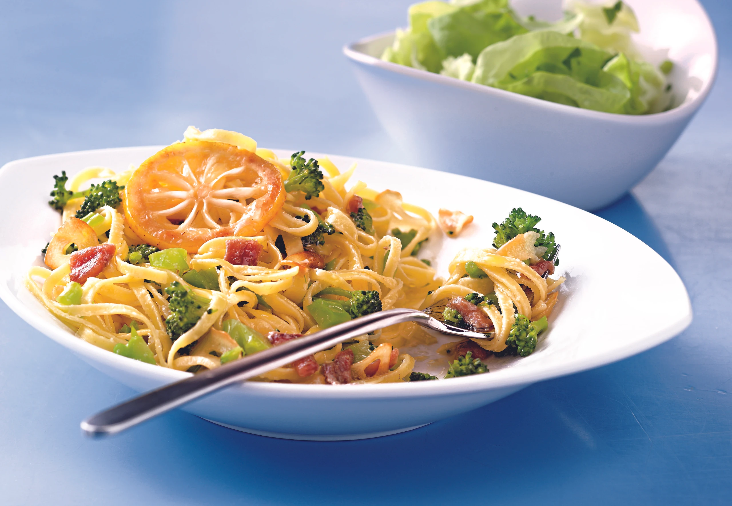 Nudeln abseihen und kurz abtropfen lassen. Nudeln, Brokkoli, Sardellen, 1?2 EL Zitronensaft und Zitronenschale vermischen. Nudeln mit Salz und Pfeffer abschmecken, mit den gebratenen Zitronenscheiben garnieren.