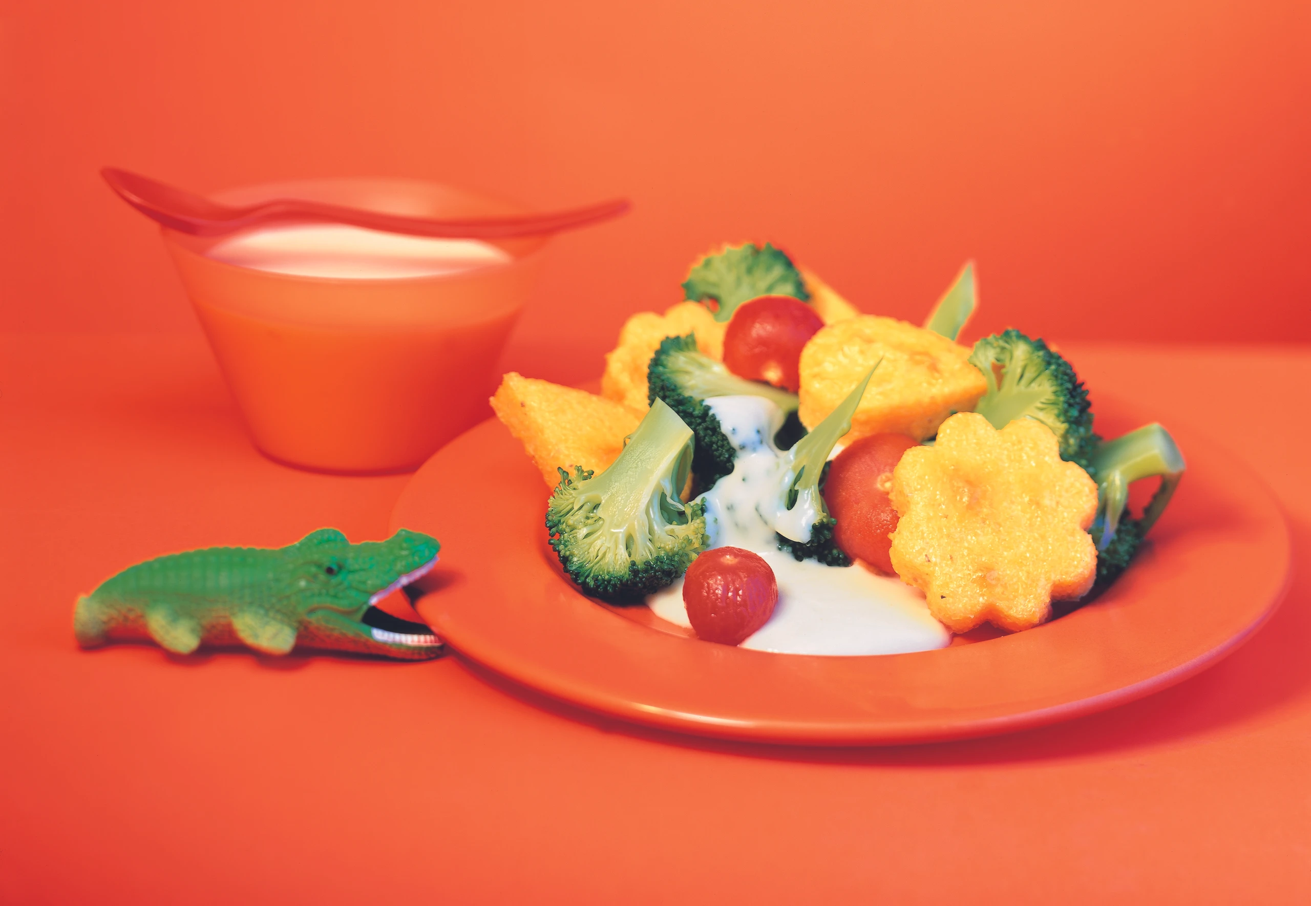 Cocktailparadeiser waschen. Brokkoli putzen, in gleich große Röschen teilen. In einem Topf mit Siebeinsatz Wasser aufkochen. Brokkoli in das Sieb legen und zugedeckt ca. 5 Minuten bissfest dämpfen. Paradeiser zugeben und das Gemüse gemeinsam noch 3 Minuten dämpfen. Paradeiser schälen und mit den Brokkoliröschen, der Käsesauce und den Polentablüten anrichten.