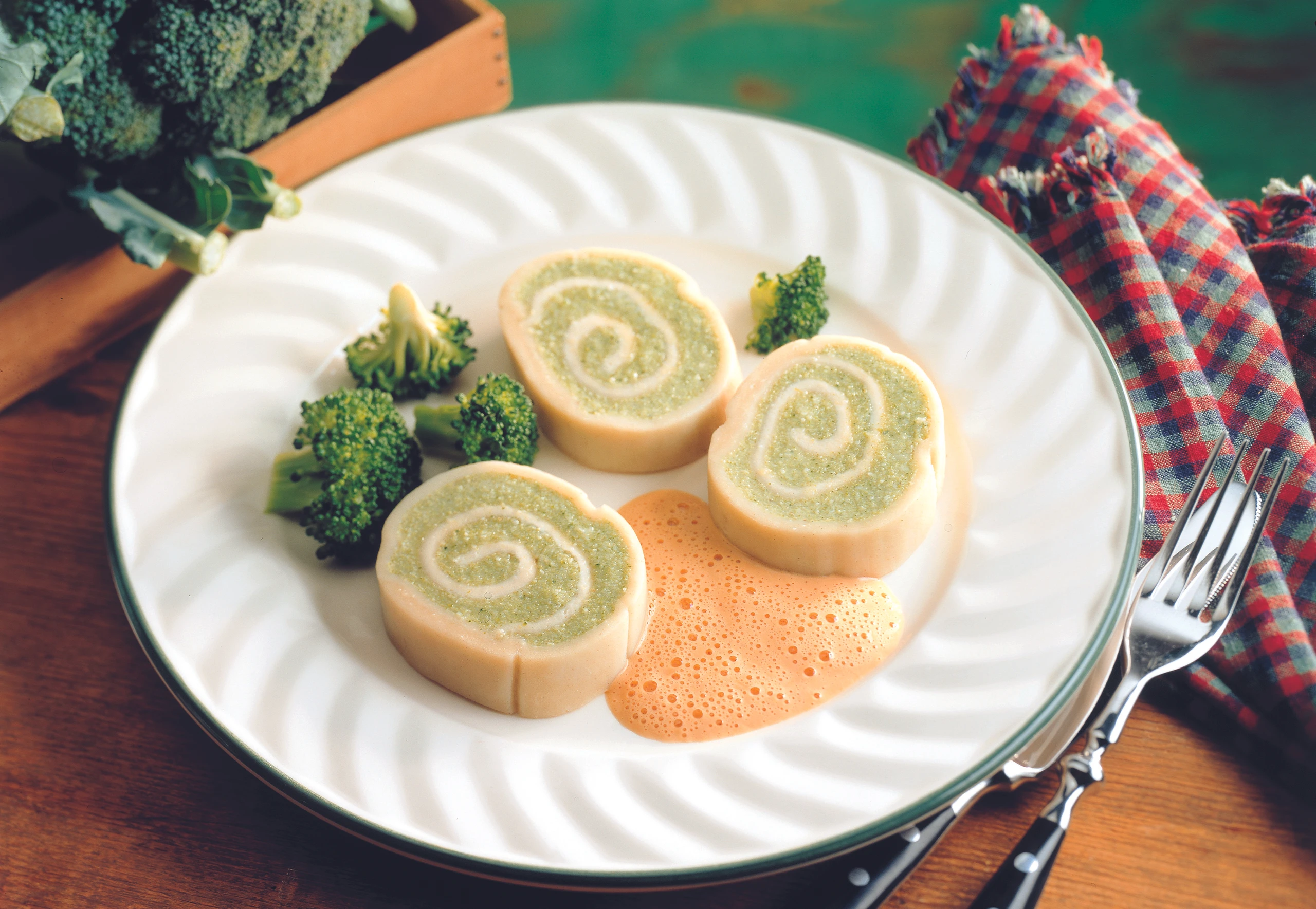 Roulade gut abtropfen lassen, aus dem Tuch wickeln, in gleichdicke Scheiben schneiden und mit der Thunfischsauce anrichten.