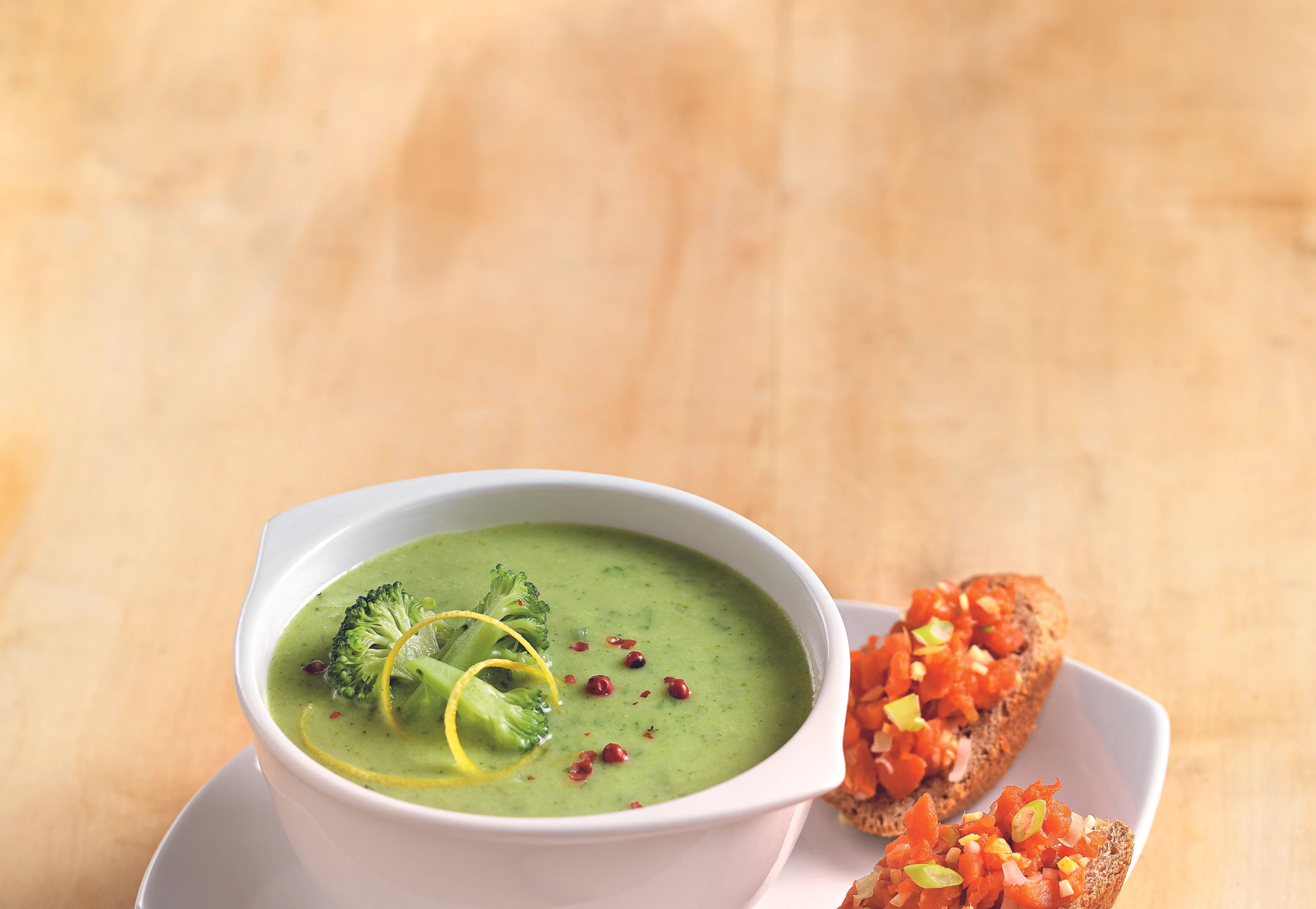 - Für die Crostini Räucherlachs klein schneiden. Übrige Jungzwiebeln putzen und in feine Ringe schneiden. Die Hälfte der Zitronenzesten fein hacken, mit Räucherlachs, Jungzwiebeln, Ingwer und restlichen Zitronensaft vermischen. Brotscheiben toasten, Lachstatar darauf verteilen. Suppe mit Brokkoliröschen, restlichen Zitronenzesten und Rosa Pfeffer garnieren und mit den Crostini servieren.