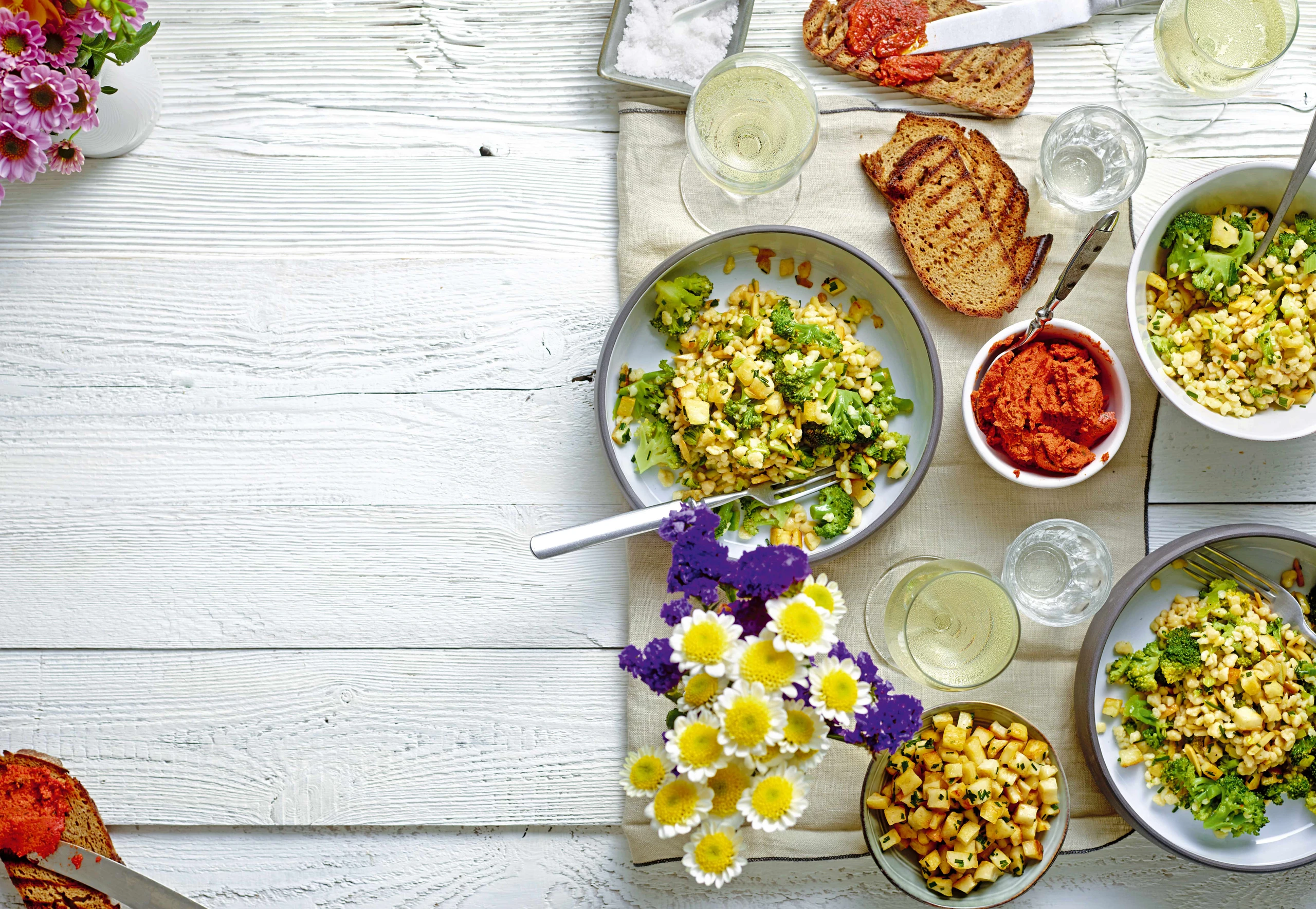 Brokkoli, Tarhonya, Mandeln und Lauch mit der Marinade vermischen und kurz ziehen lassen. Salat anrichten und mit Halloumi bestreut servieren. Dazu passt getoastetes Schwarzbrot und .