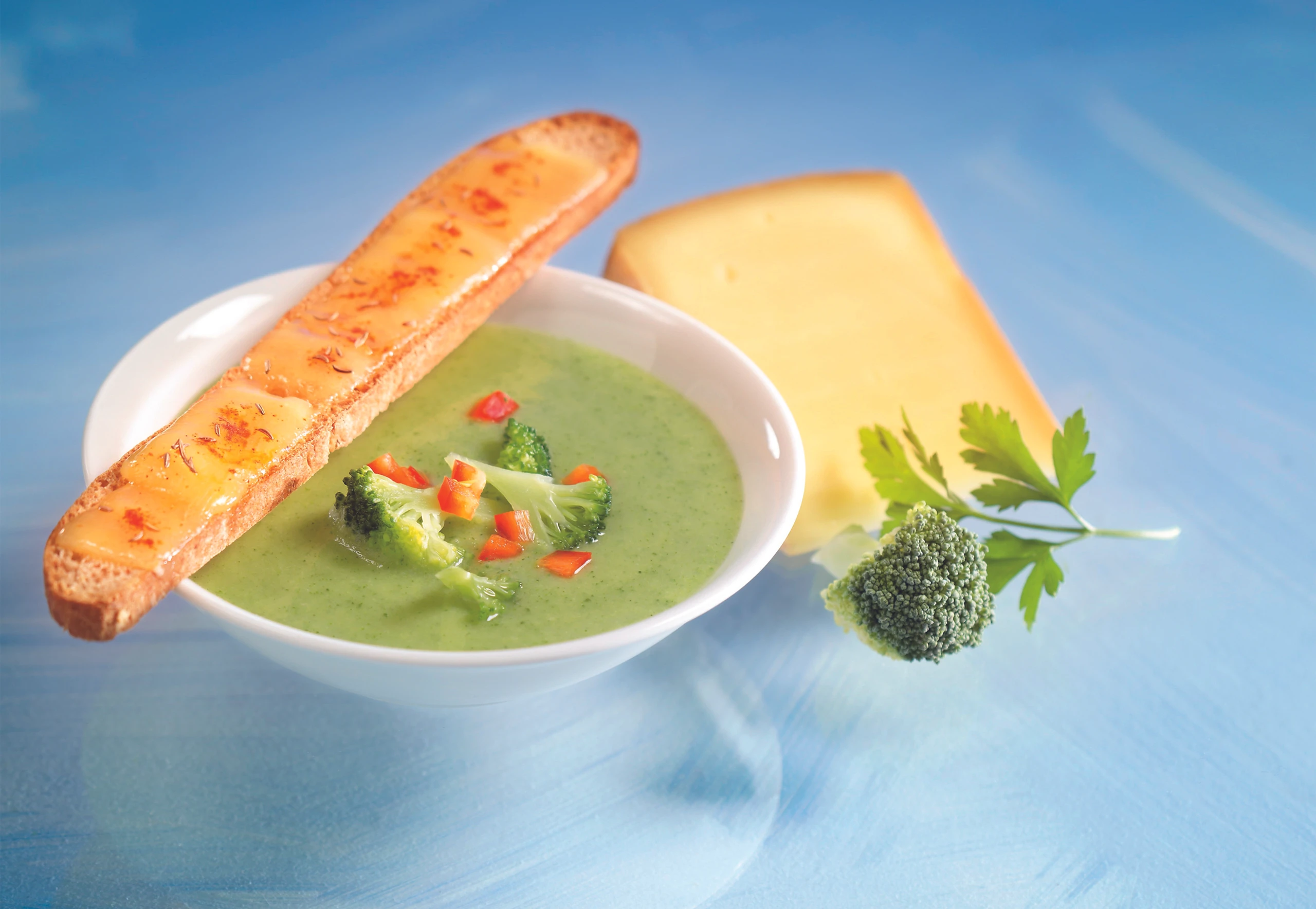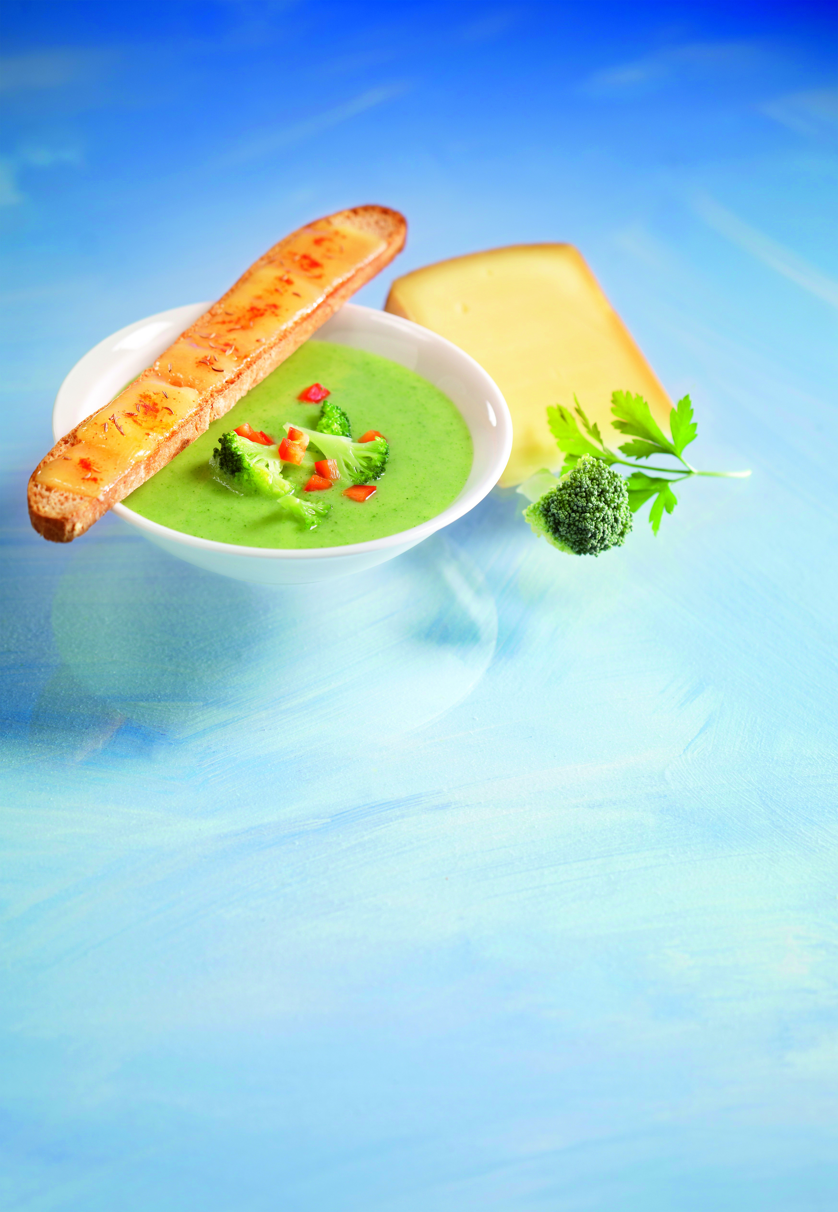 Suppe mit Brokkoliröschen und Paprikawürfeln garnieren und mit den Käsecroûtons servieren.