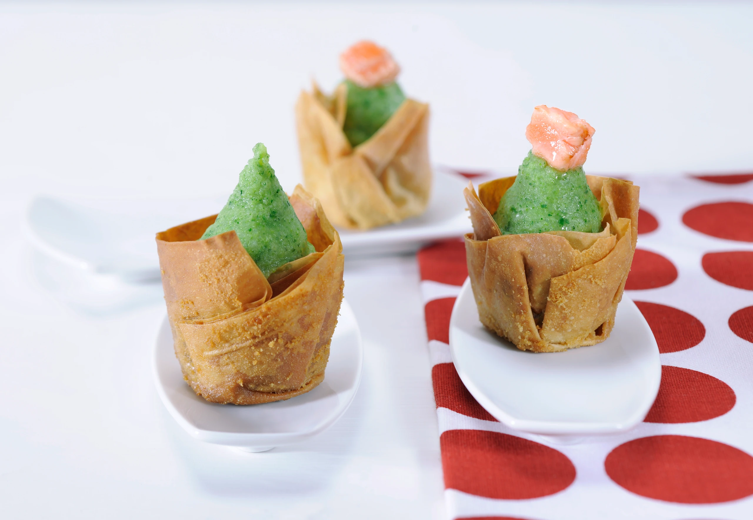Brokkolipüree im Strudelblatt mit Lachswürfeln