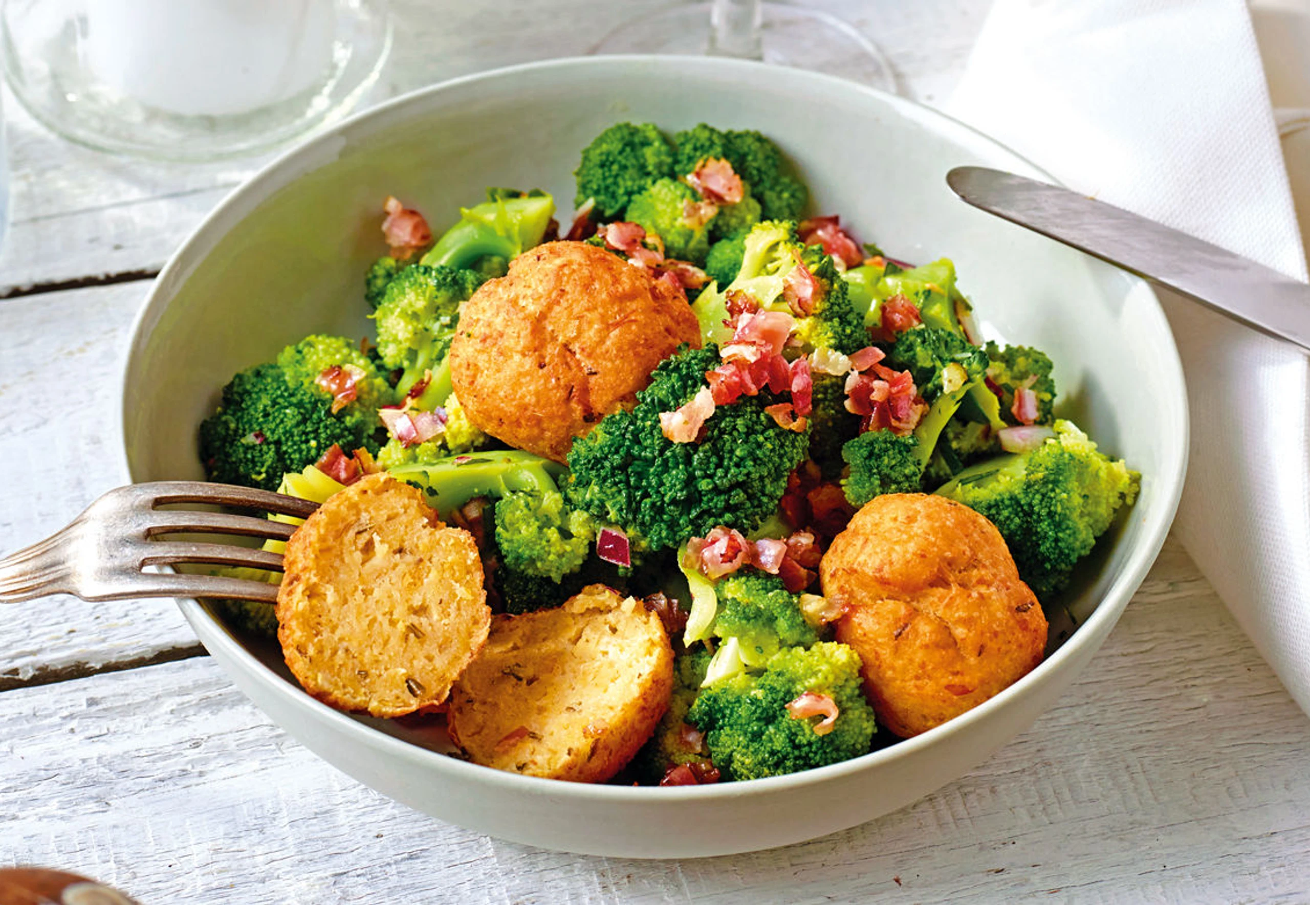 Brokkolisalat mit Speck und Käsebällchen