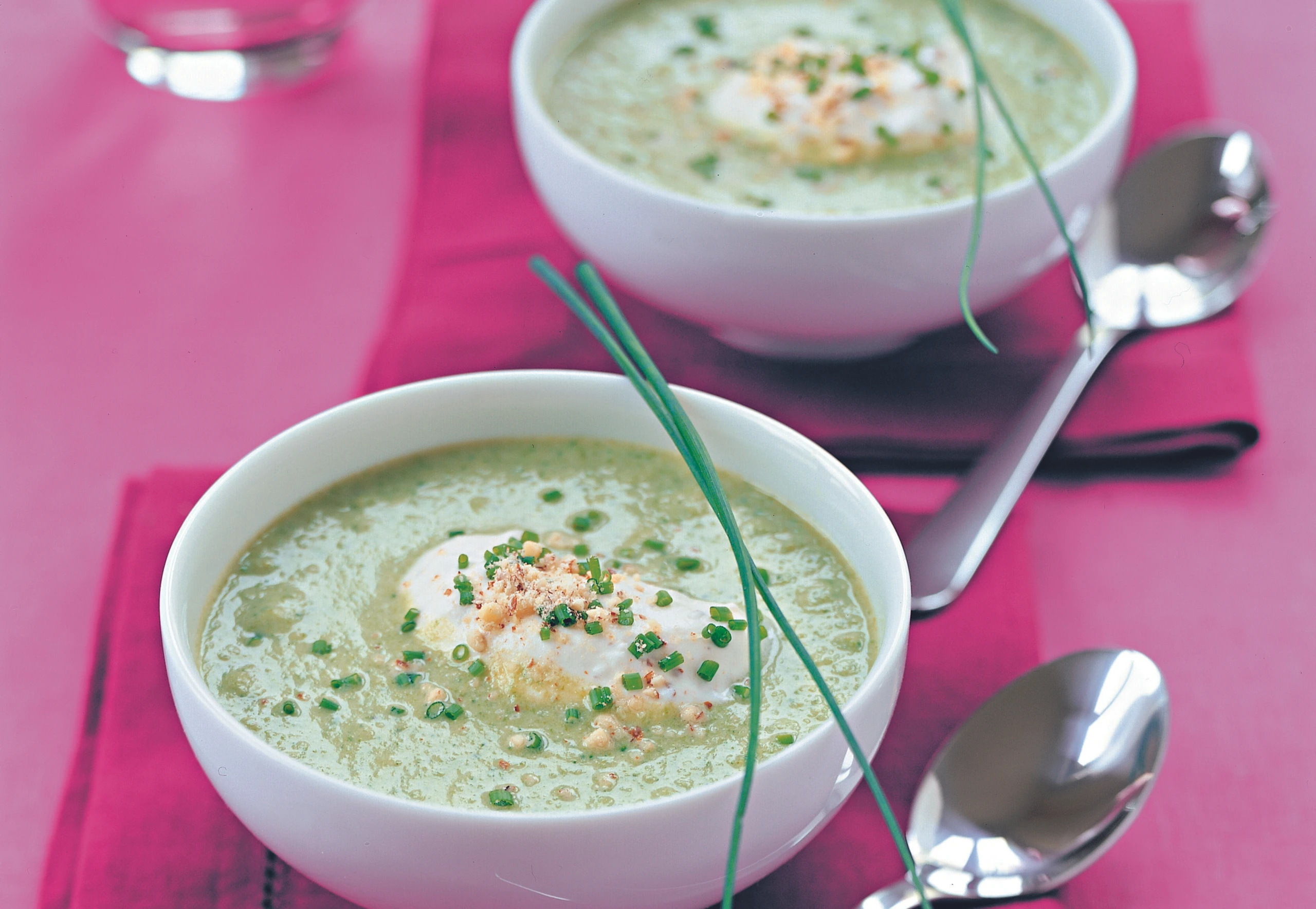Suppe pürieren, mit Salz, Pfeffer und Muskat würzen. Suppe mit Mandelobers anrichten, mit Schnittlauch und übrigen Mandeln bestreuen.