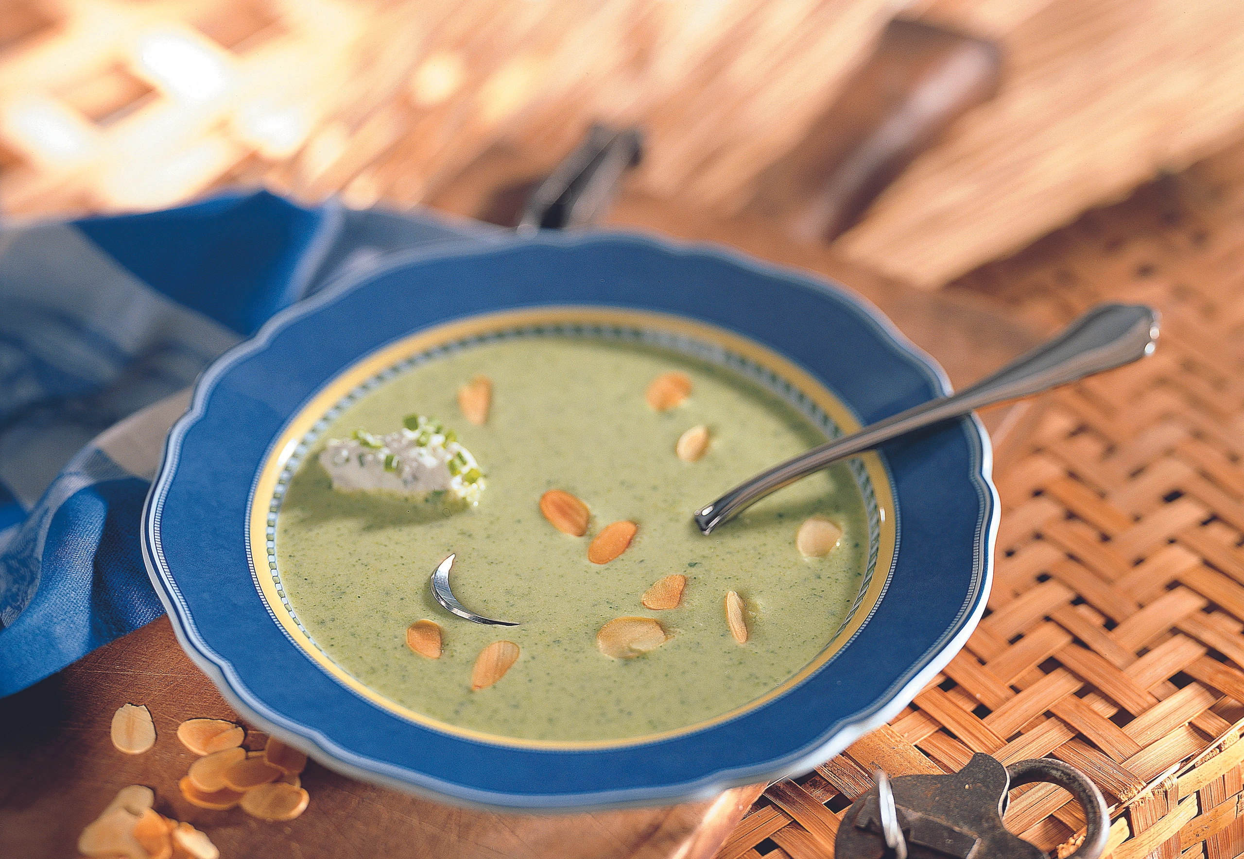 Brokkolisuppe mit Schnittlauchobers und Mandeln