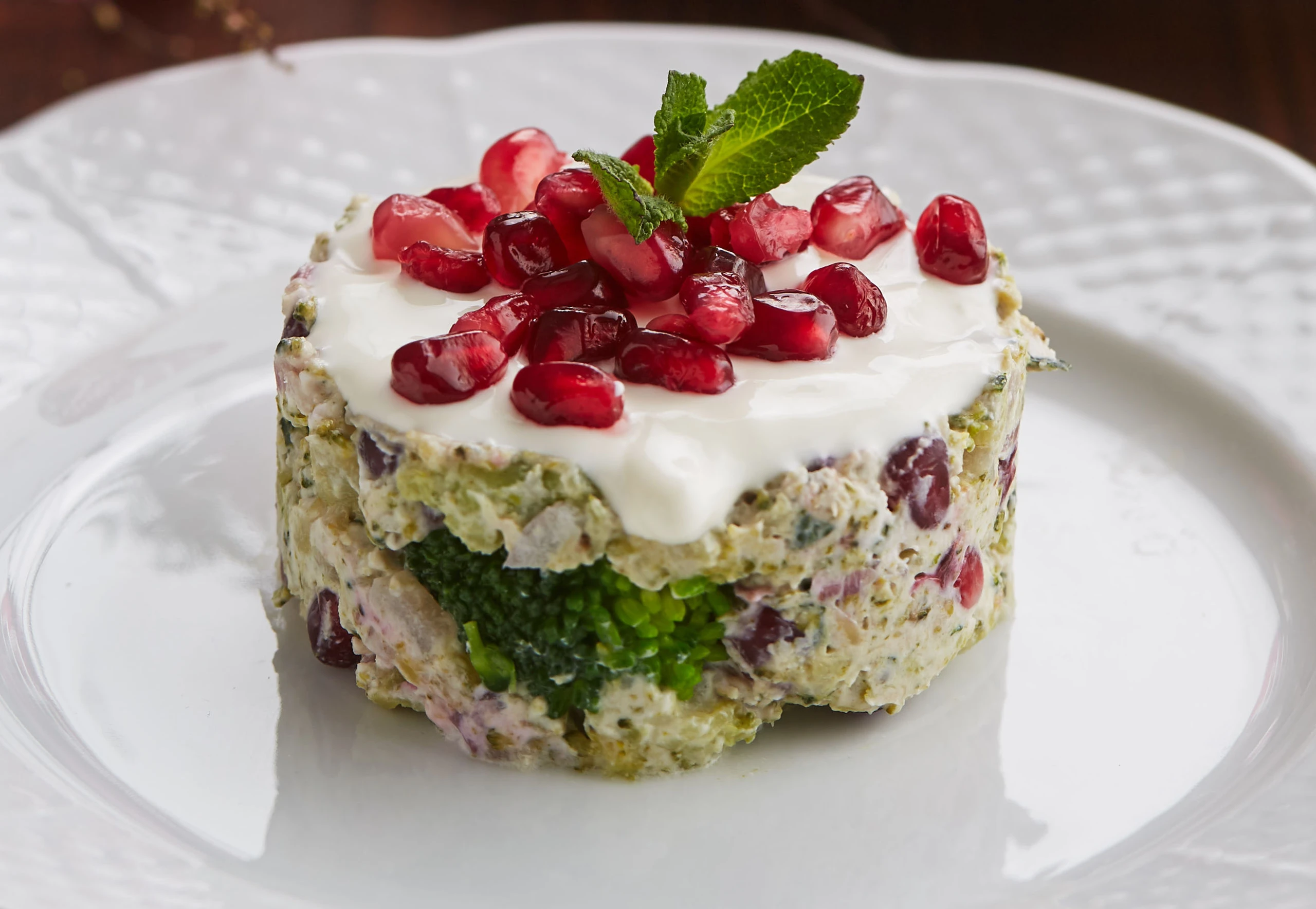 Brokkolitatar mit Ziegenkäse und Granatapfel