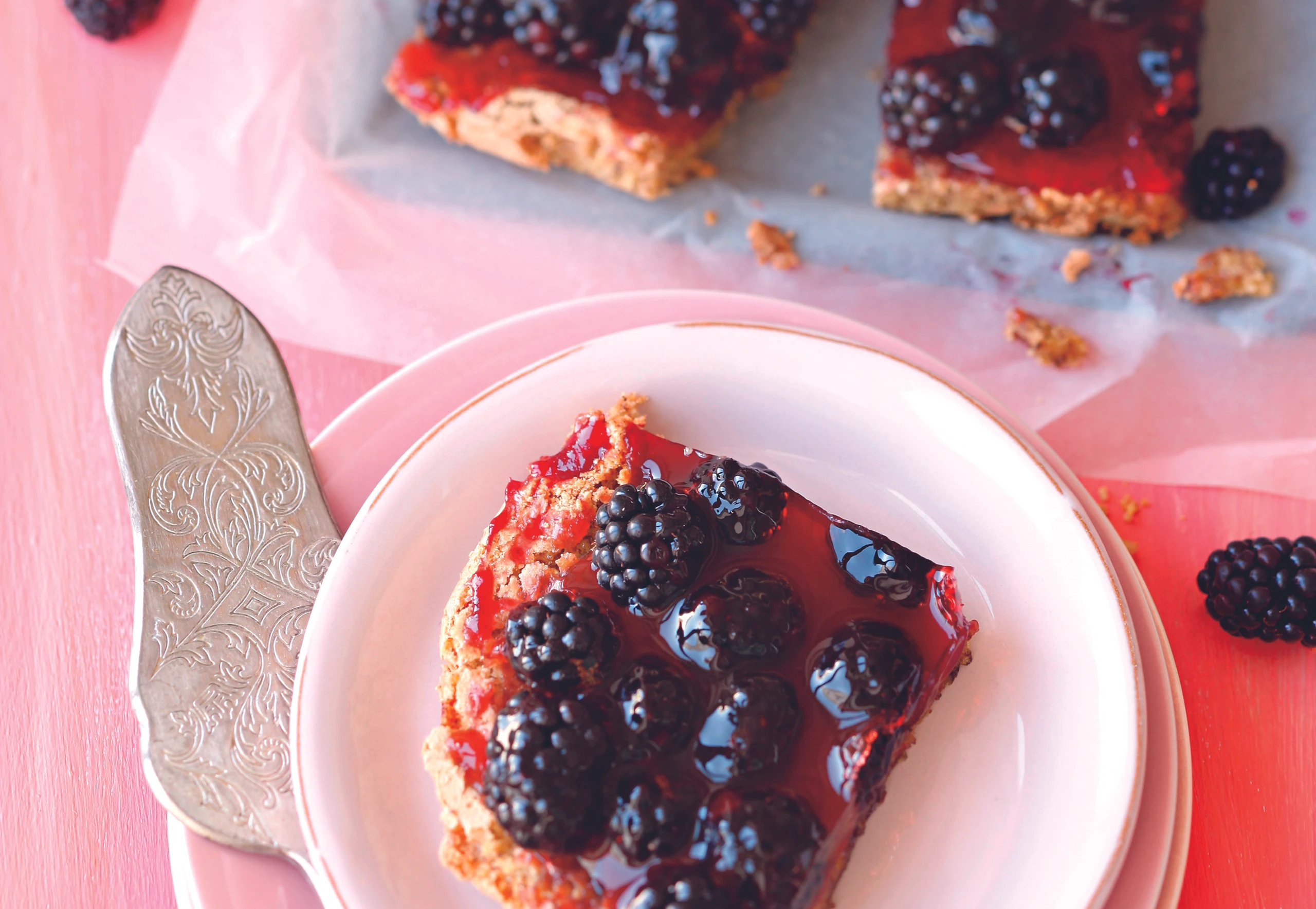 Für den Belag Brombeeren verlesen. Kuchen mit Marmelade bestreichen und mit den Beeren belegen. Gelee laut Packungsanleitung zubereiten und gleichmäßig über die Brombeeren gießen. Kuchen für ca. 30 Minuten kühl stellen. Kuchen portionieren.