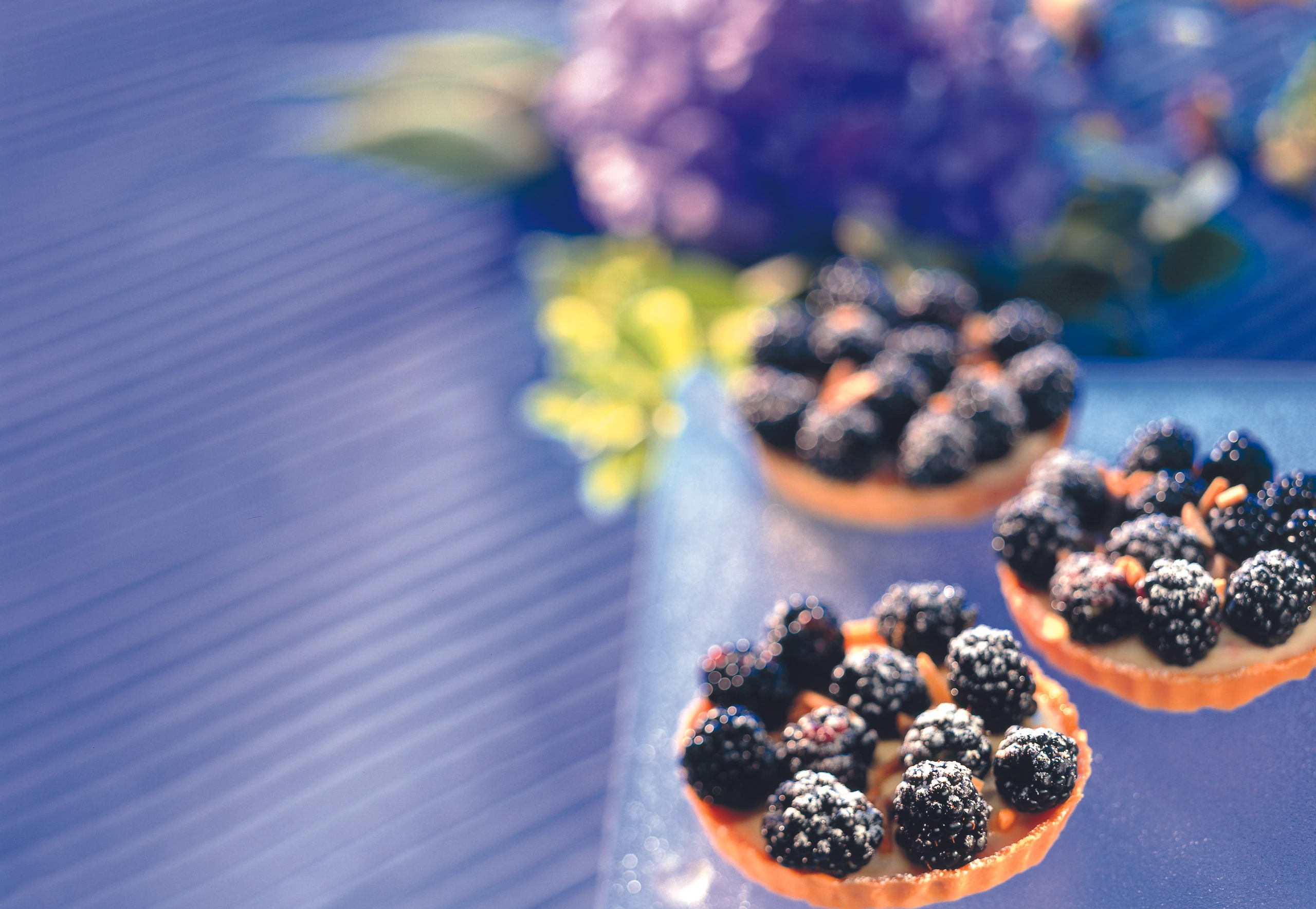 Törtchen mit Brombeeren belegen, mit Mandelstiften garnieren und mit Staubzucker bestreuen.