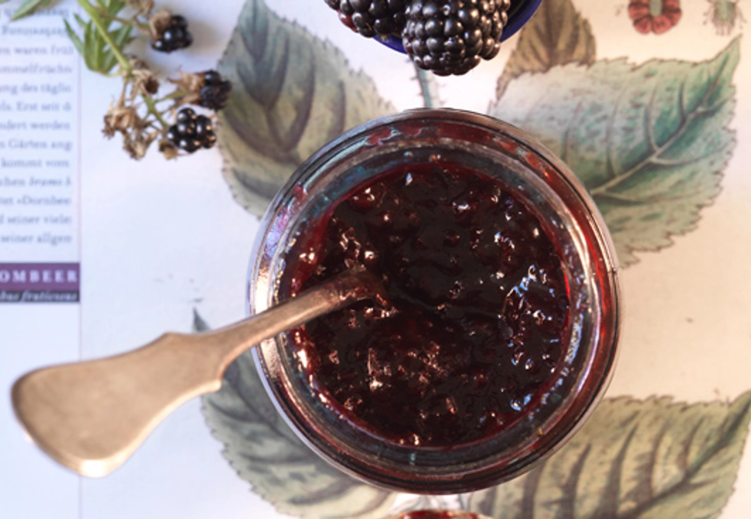 - Vanilleschote, Zitronenschale und -saft, Brombeeren, Gelierzucker und Zitronenverbeneblätter in einen Topf geben und ca. 15 Minuten sprudelnd kochen.