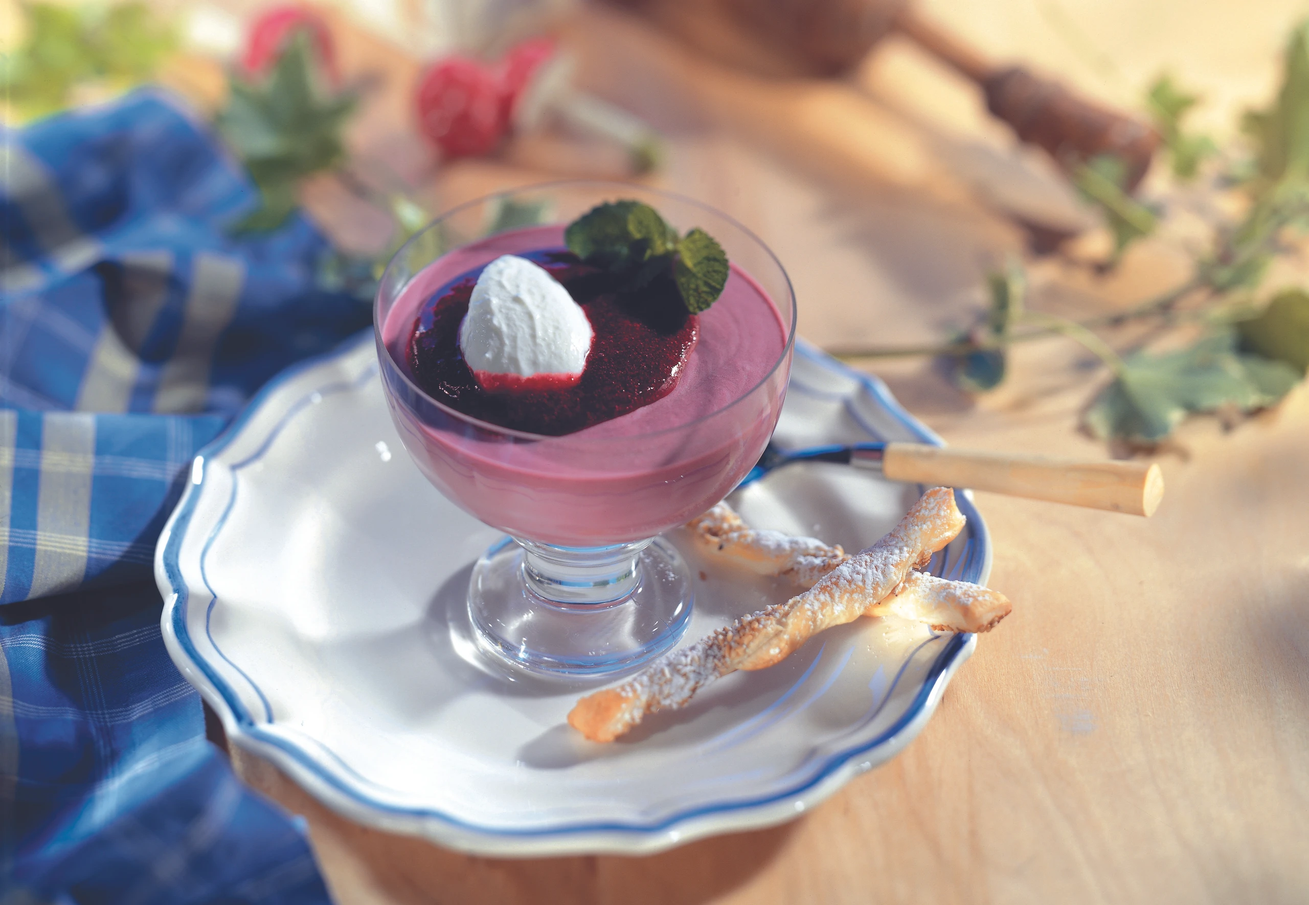 Ein wenig vom Brombeerpüree über Wasserdampf erwärmen, gut ausgedrückte Gelatine darin auflösen, restliche Masse zügig einrühren, Obers unterheben. Creme in Gläser füllen und zum Festwerden kühl stellen.