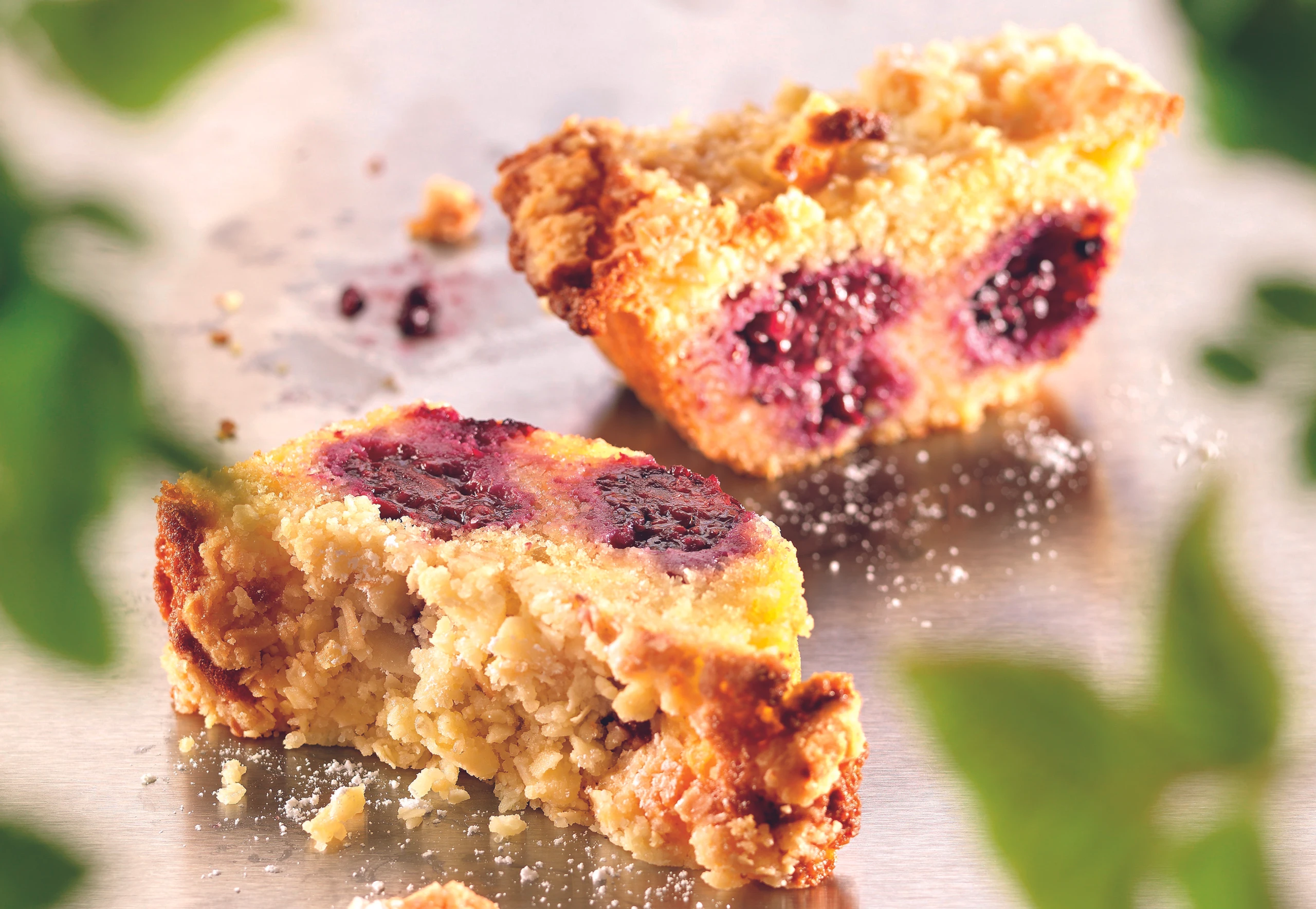 Für den Kuchen Brombeeren verlesen. Mehl mit Backpulver versieben. Butter, Staubzucker, Zitronenschale, 1 Prise Salz und Vanille-zucker schaumig schlagen. Eier verquirlen und nach und nach zugeben, Frischkäse unterrühren. Mehlmischung unterheben, Beeren untermengen.