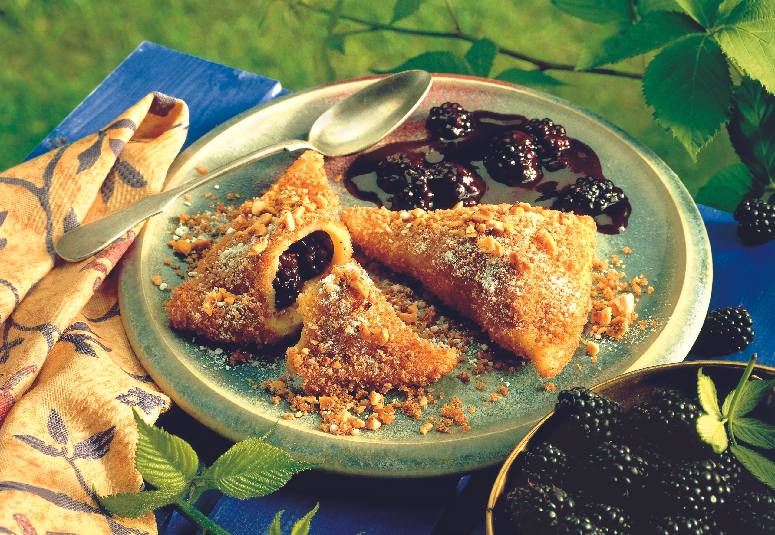 Tascherl mit einem Siebschöpfer aus dem Wasser heben, gut abtropfen lassen und behutsam in den Butterbröseln wenden. Tascherln mit Brombeersauce (siehe Rezept) anrichten, mit Staubzucker und gehackten Nüssen bestreut servieren.