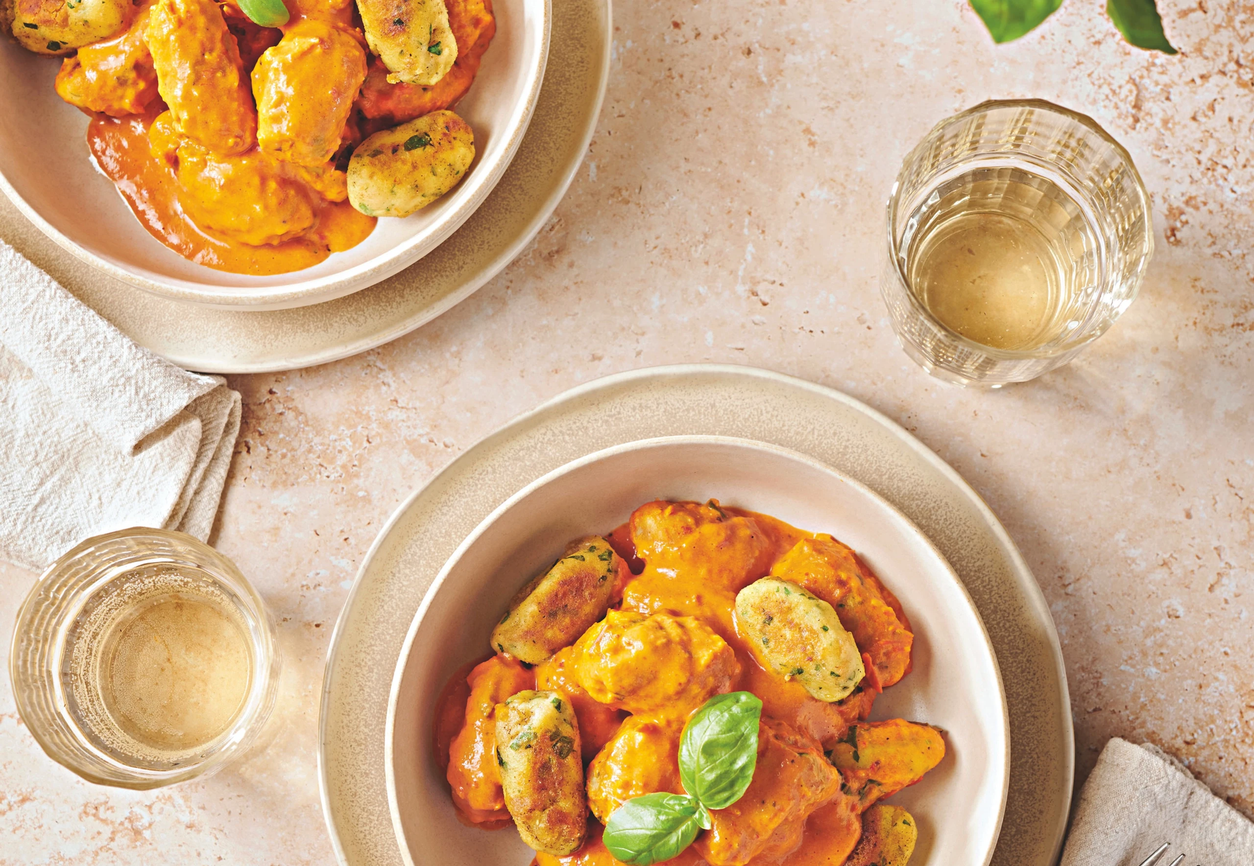 Gnocchi in einer Pfanne mit 2 EL Olivenöl rundum goldbraun anbraten, Sauce zugeben und aufkochen. Mit Salz und Pfeffer abschmecken. Mit Basilikum garniert servieren.