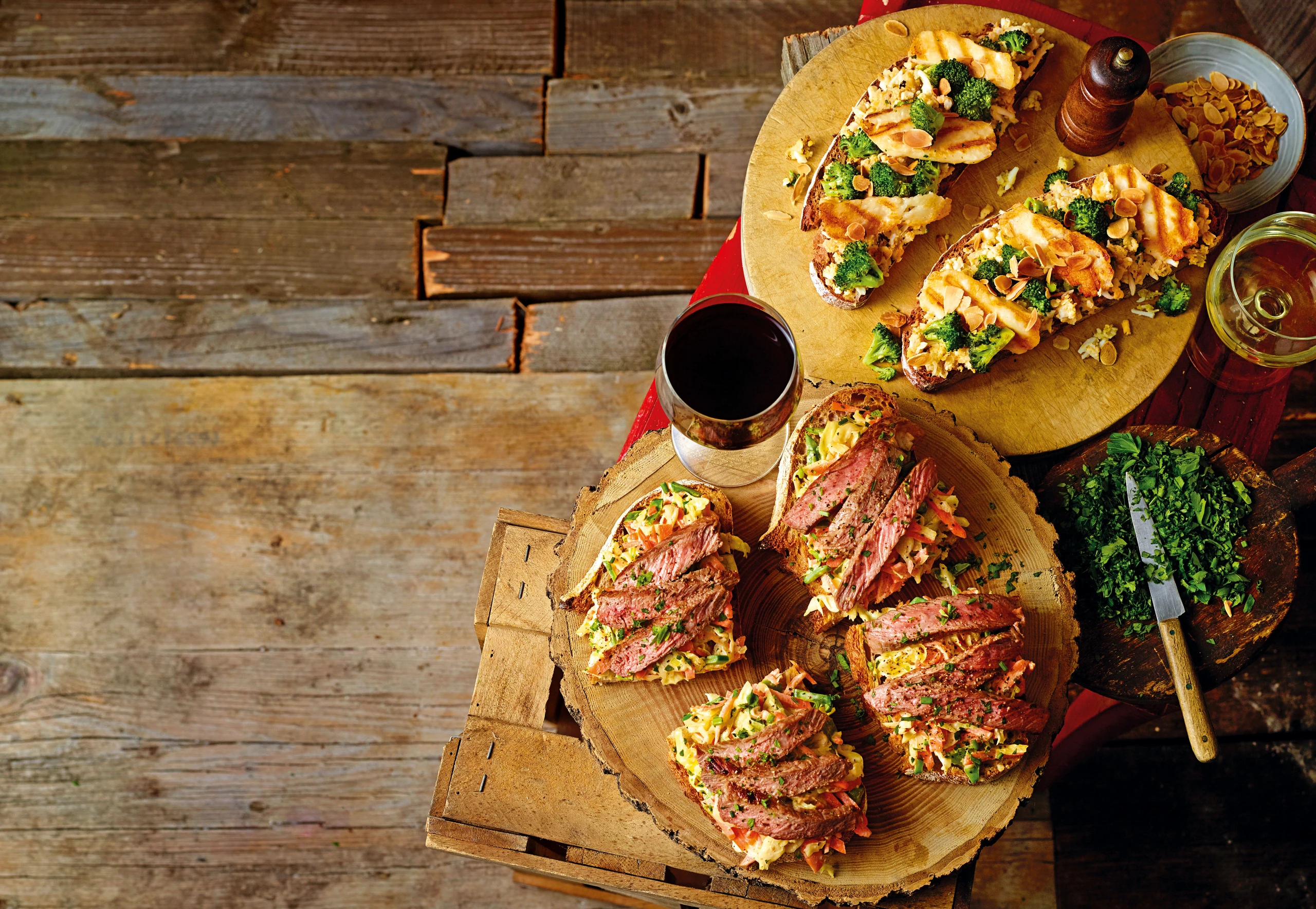 Rohr auf Grillstellung schalten. Brote auf ein Backblech legen und im Rohr beidseitig toasten. Karfiolmasse auf den Broten verteilen, mit Brokkoli und Halloumi belegen und mit Mandeln bestreuen.