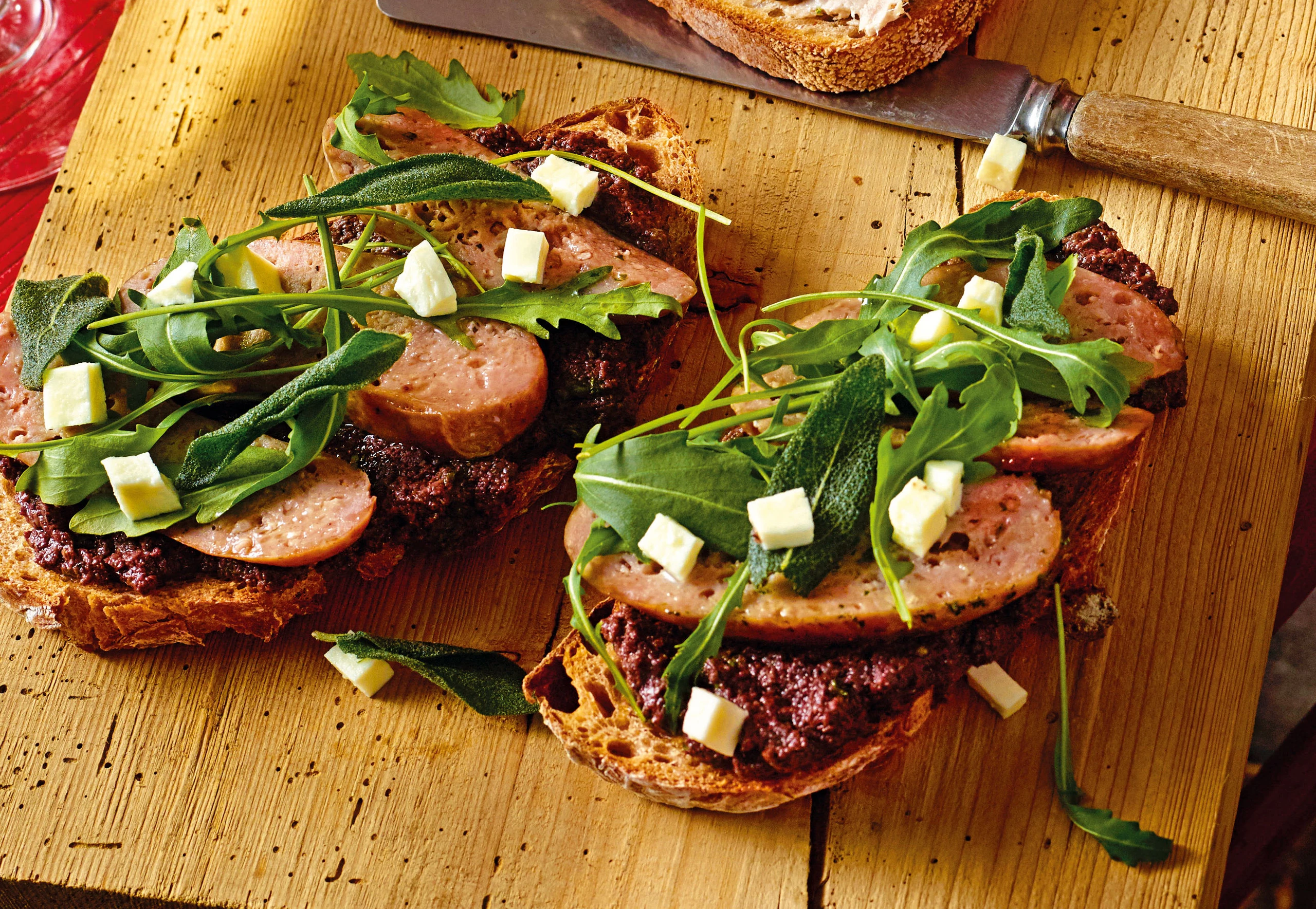 Brot mit Olivenpesto, Salsiccia, Mozzarella und Rucola