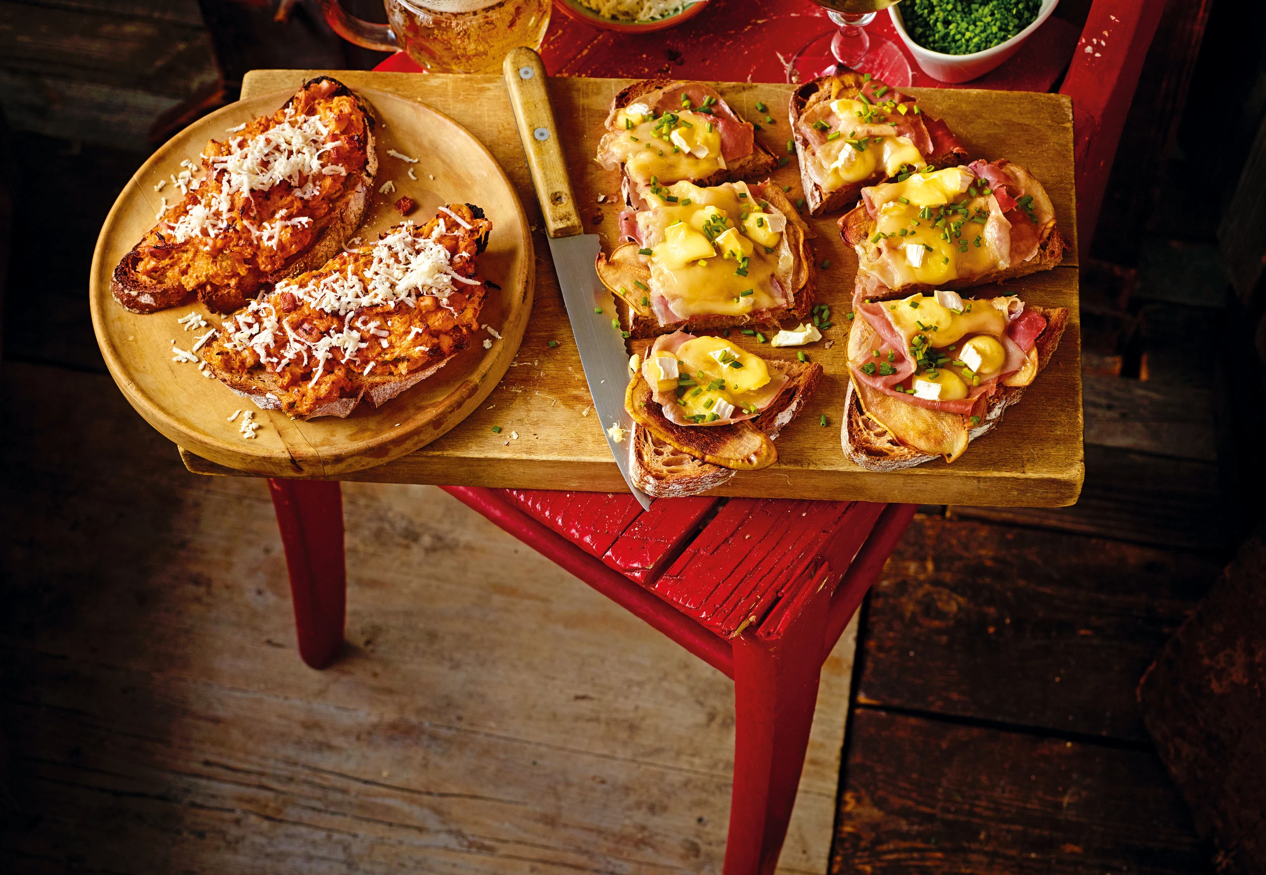 Rohr auf Grillstellung vorheizen. Brote auf ein Backblech legen und im Rohr (mittlere Schiene) beidseitig kurz toasten. Brote mit Senf bestreichen, Belag darauf verteilen. Brote im Rohr (mittlere Schiene) ca. 8 Minuten überbacken und mit Kren bestreuen.