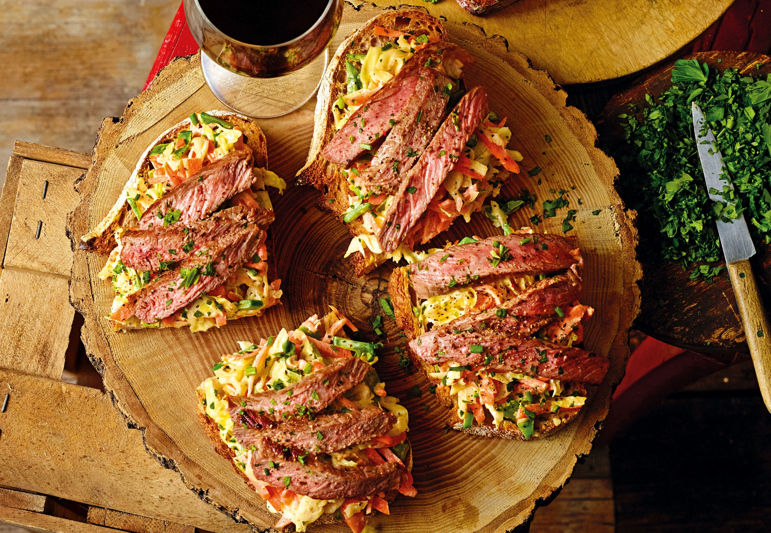 Rohr auf Grillstellung schalten. Brote auf ein Backblech legen und im Rohr beidseitig rösten. Steaks quer zur Faser in 1 cm dicke Scheiben schneiden. Brote etwas abkühlen lassen, Krautsalat darauf verteilen, mit Fleisch belegen und mit Petersilie bestreuen.