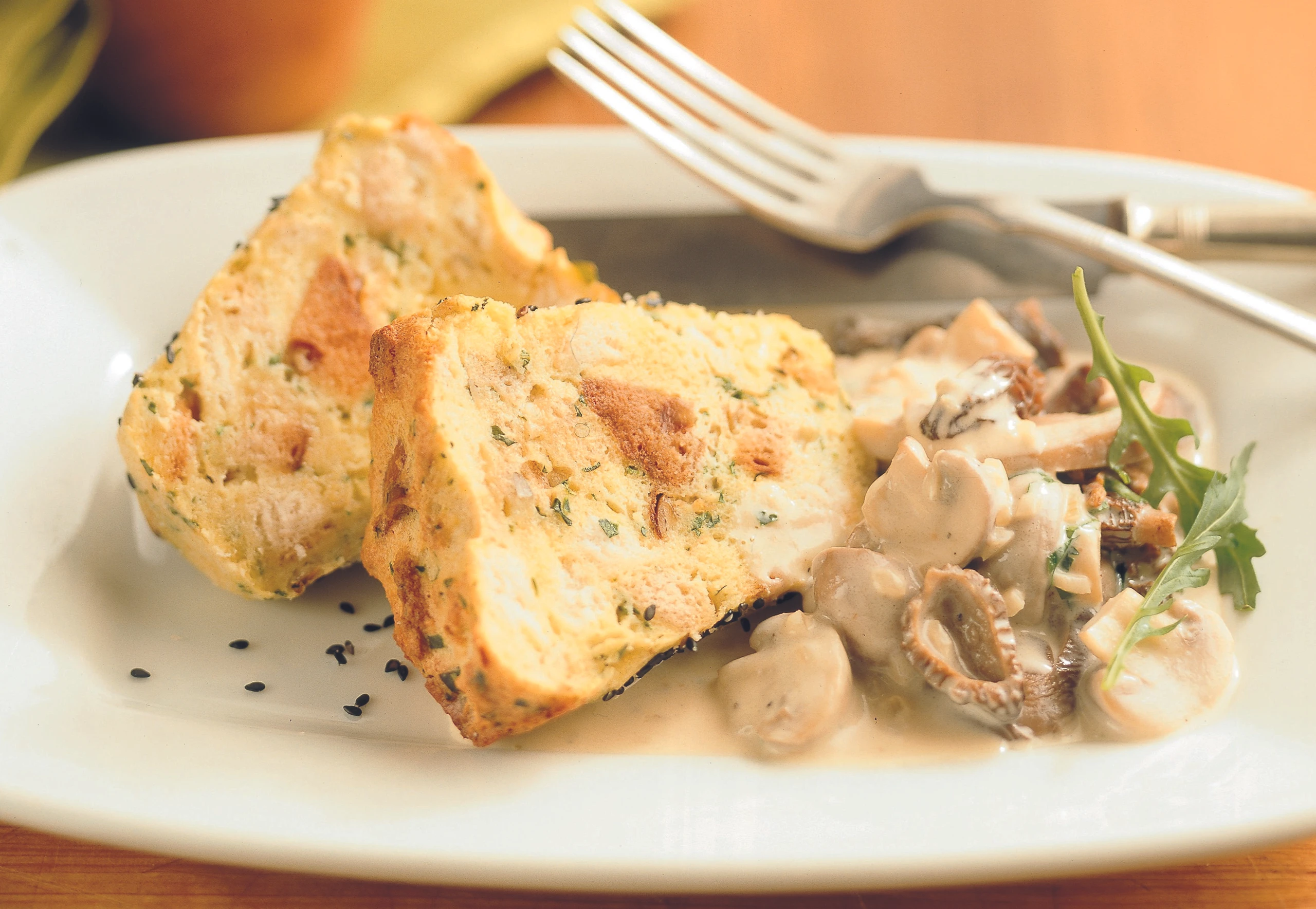 Brotauflauf mit Rucola und Schwammerl-Ragout