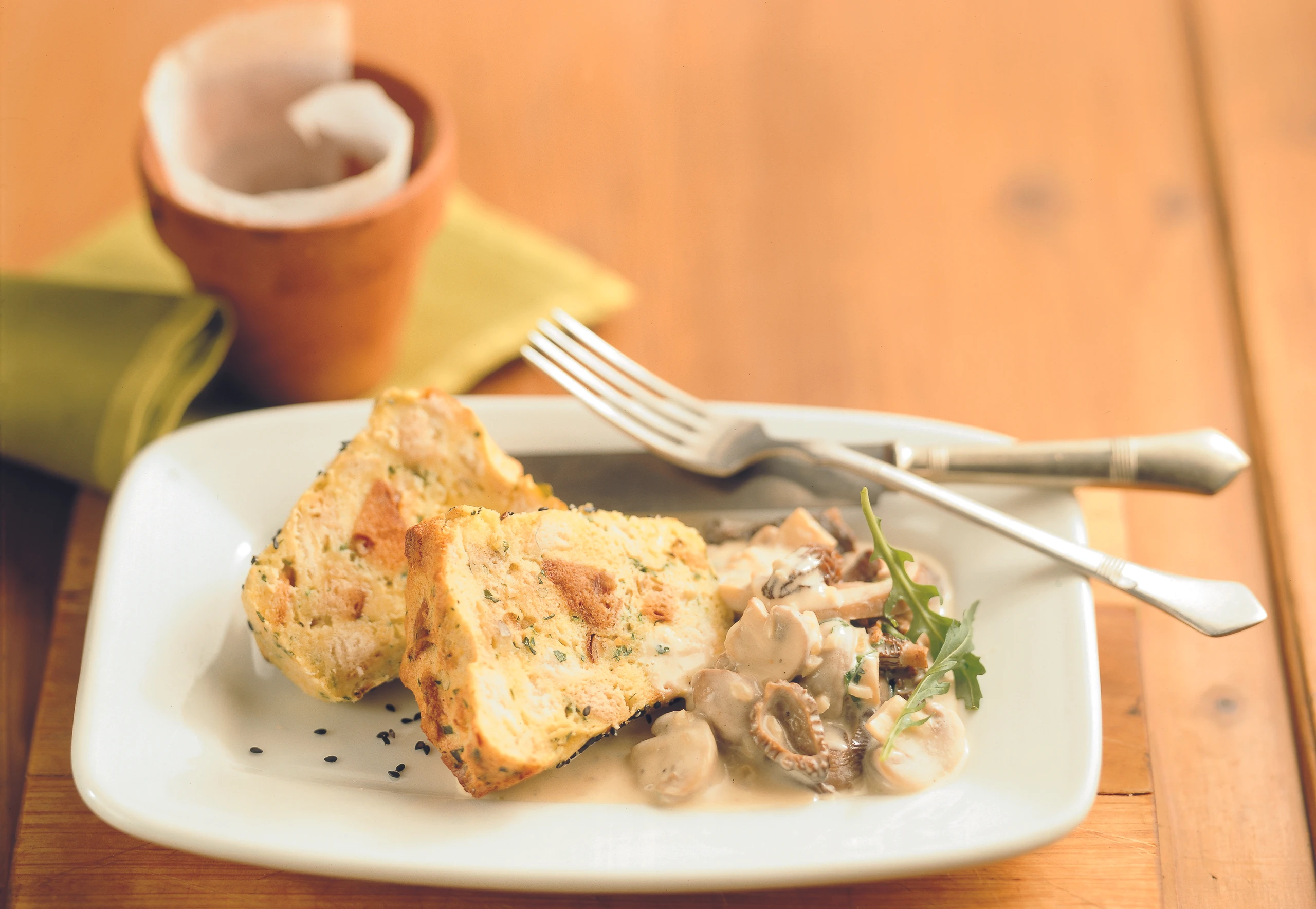 Die Aufläufe auf das Backblech im Rohr stellen und ca. 30 Minuten backen. Aufläufe aus den Förmchen stürzen und mit dem Schwammerl-Ragout servieren.