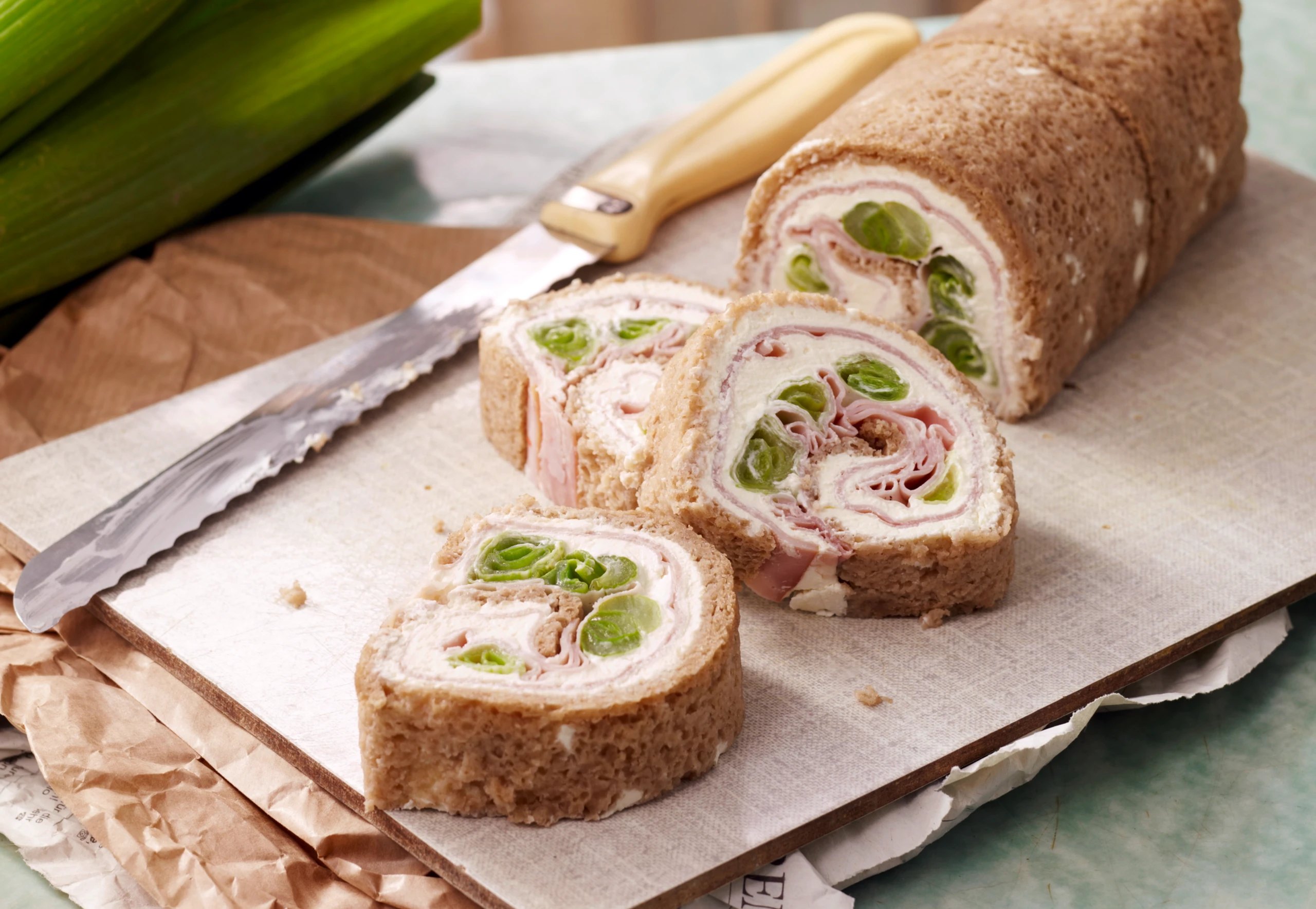 Obere Folie entfernen. Zwei Drittel der Brotfläche mit Käsefülle bestreichen und mit der Hälfte vom Schinken belegen. Schinken mit übriger Fülle bestreichen, Zwiebeln in die Fülle drücken und mit restlichem Schinken belegen. Brotscheiben mit Hilfe der Folie einrollen, in Folie wickeln und für 20 Minuten kühl stellen.