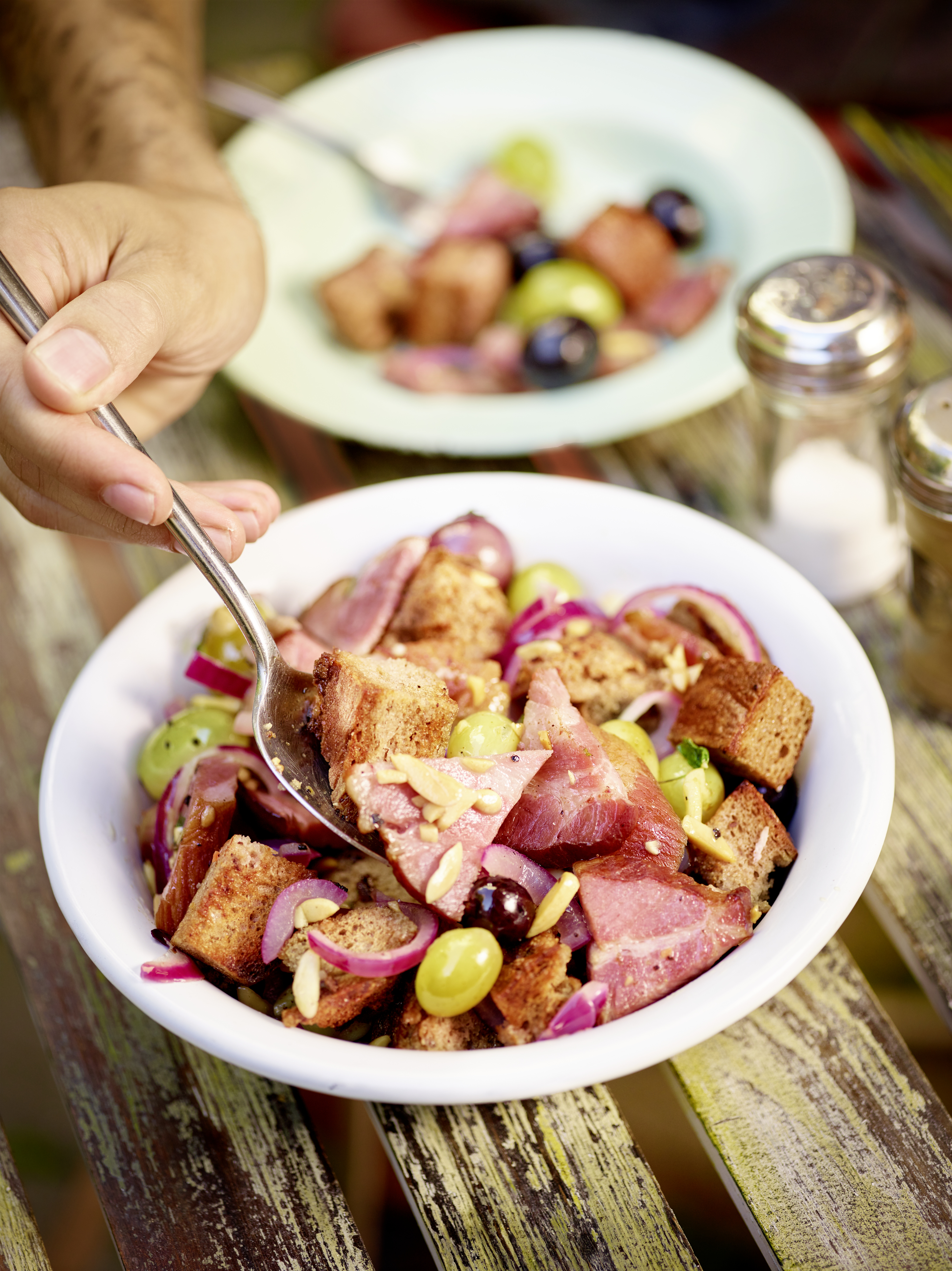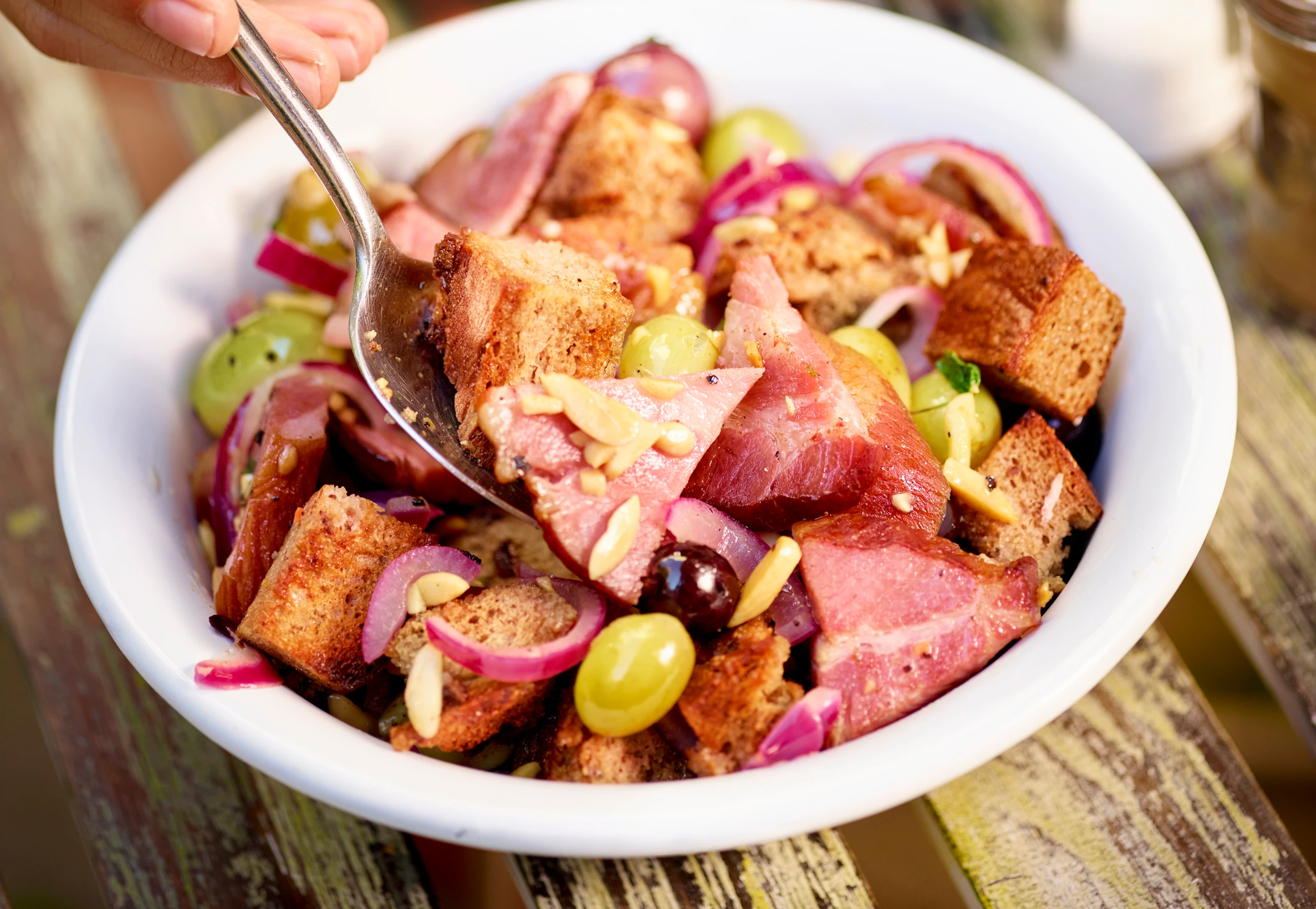 Brot in ca. 2 cm große Stücke schneiden oder zupfen. Brotstücke in einer Pfanne, ohne Zugabe von Öl knusprig bähen; dabei öfter schwenken. Mandeln in 1 EL Öl anschwitzen, Fleisch unterrühren und kurz mitbraten. Mischung zu den Trauben geben, salzen und pfeffern.