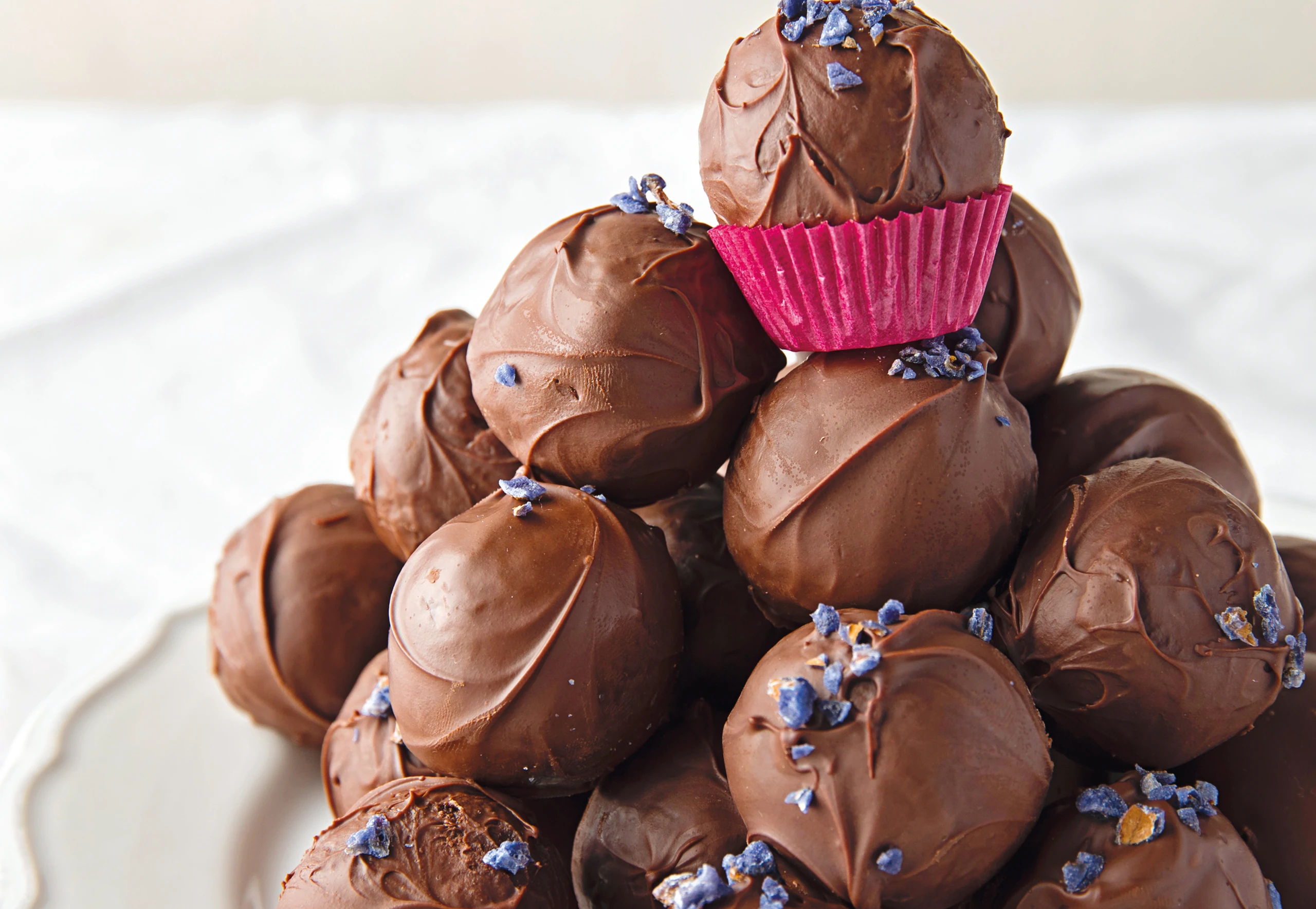 Kuvertüre und Kokosöl über einem Wasserbad schmelzen. Pralinen eintunken oder die Kuvertüre in den Handflächen verteilen und die Pralinen darin rollen. Kandierte Veilchen hacken und die Pralinen damit bestreuen.