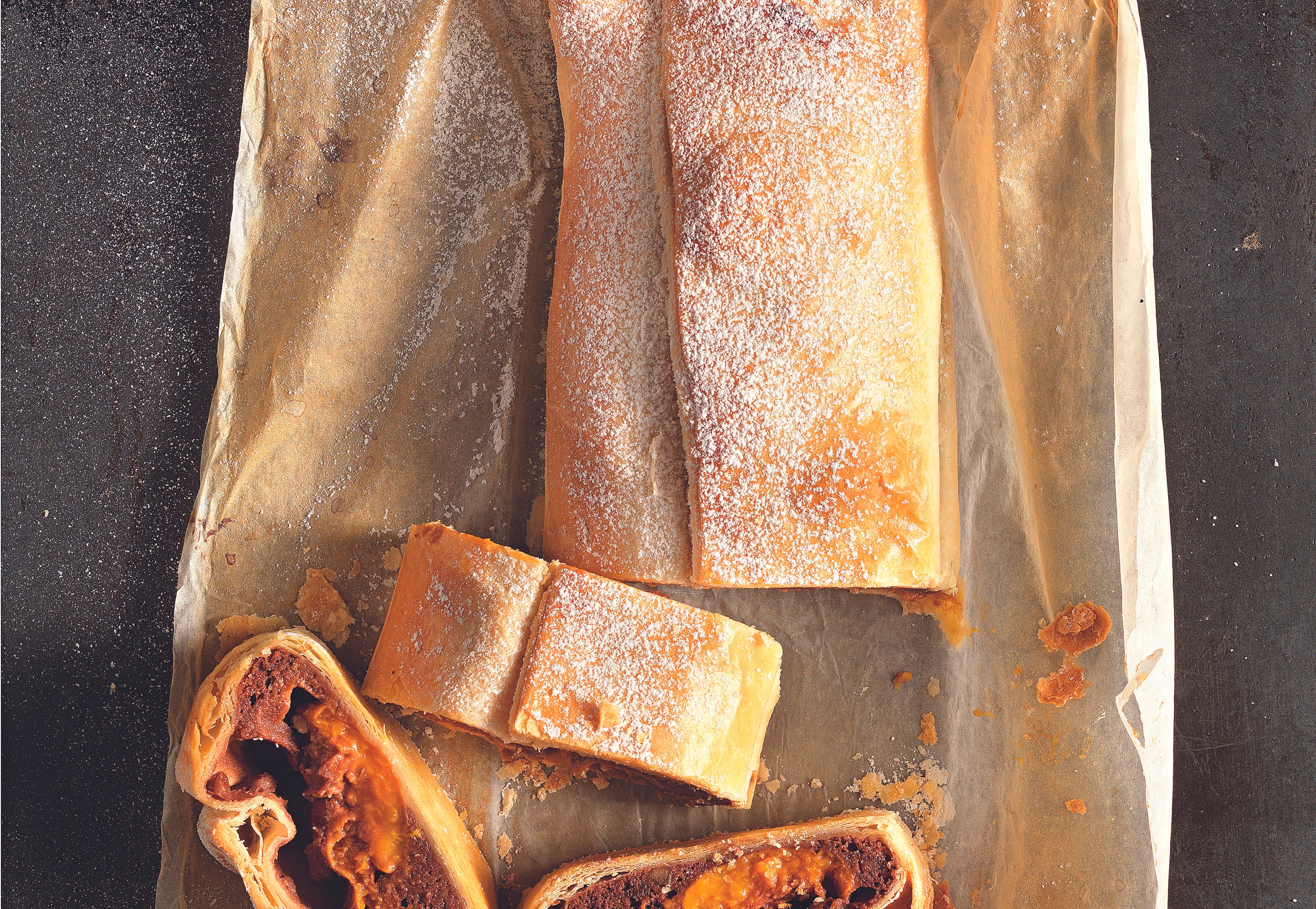 Brownie-Strudel mit eingelegten Marillen