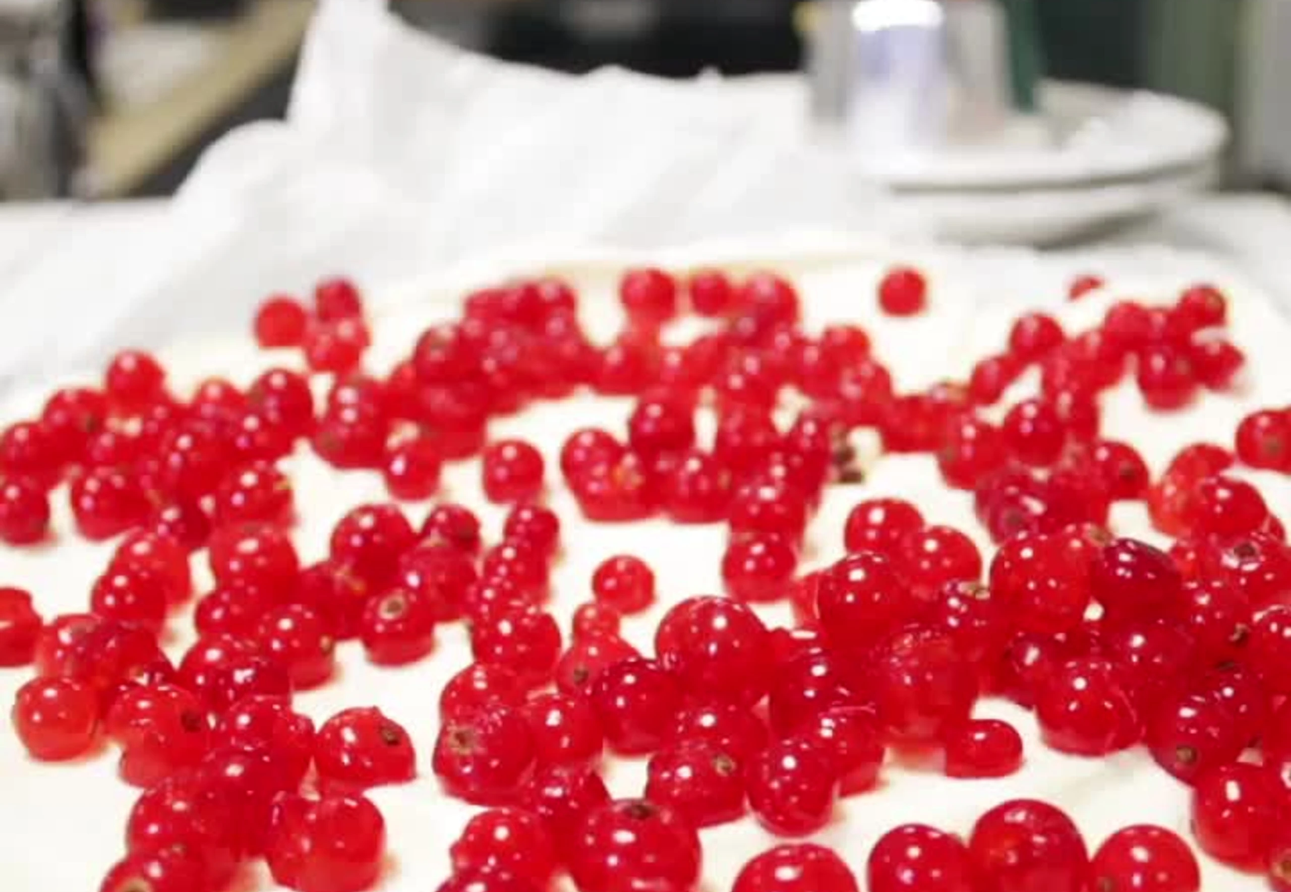 Für das Topping alle Zutaten verrühren und auf dem Kuchen verstreichen. Mit Ribiseln verzieren.