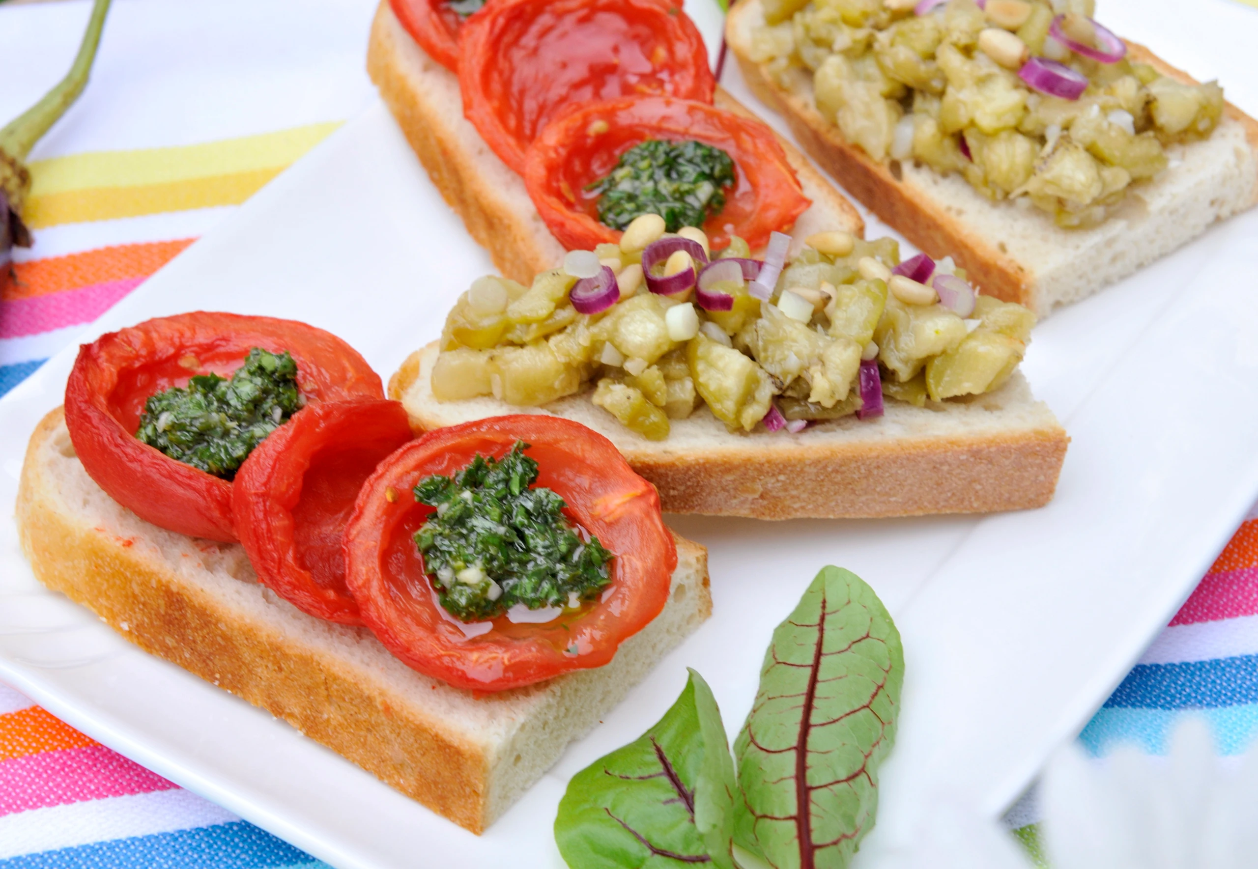 Brote im Rohr rösten und herausnehmen. Knoblauch schälen, Brote damit einreiben, mit Paradeisern belegen, Pesto daraufgeben.