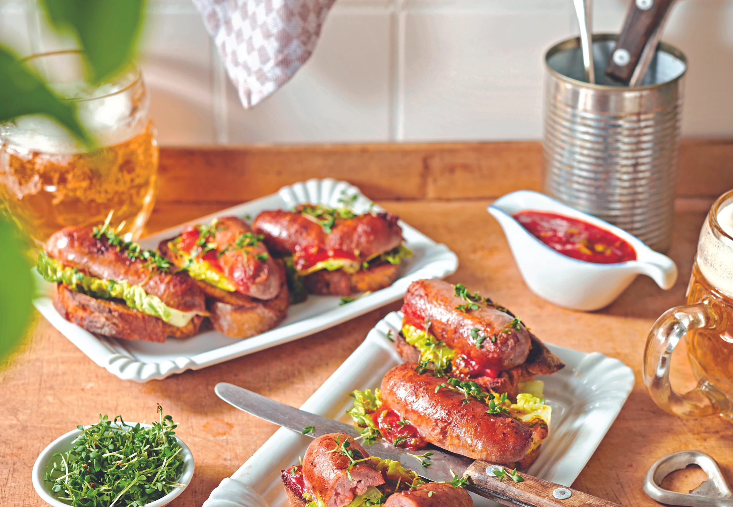 Kresse abschneiden. Brote mit Sauce bestreichen, mit Salat und Wurst belegen und mit Kresse bestreut servieren.