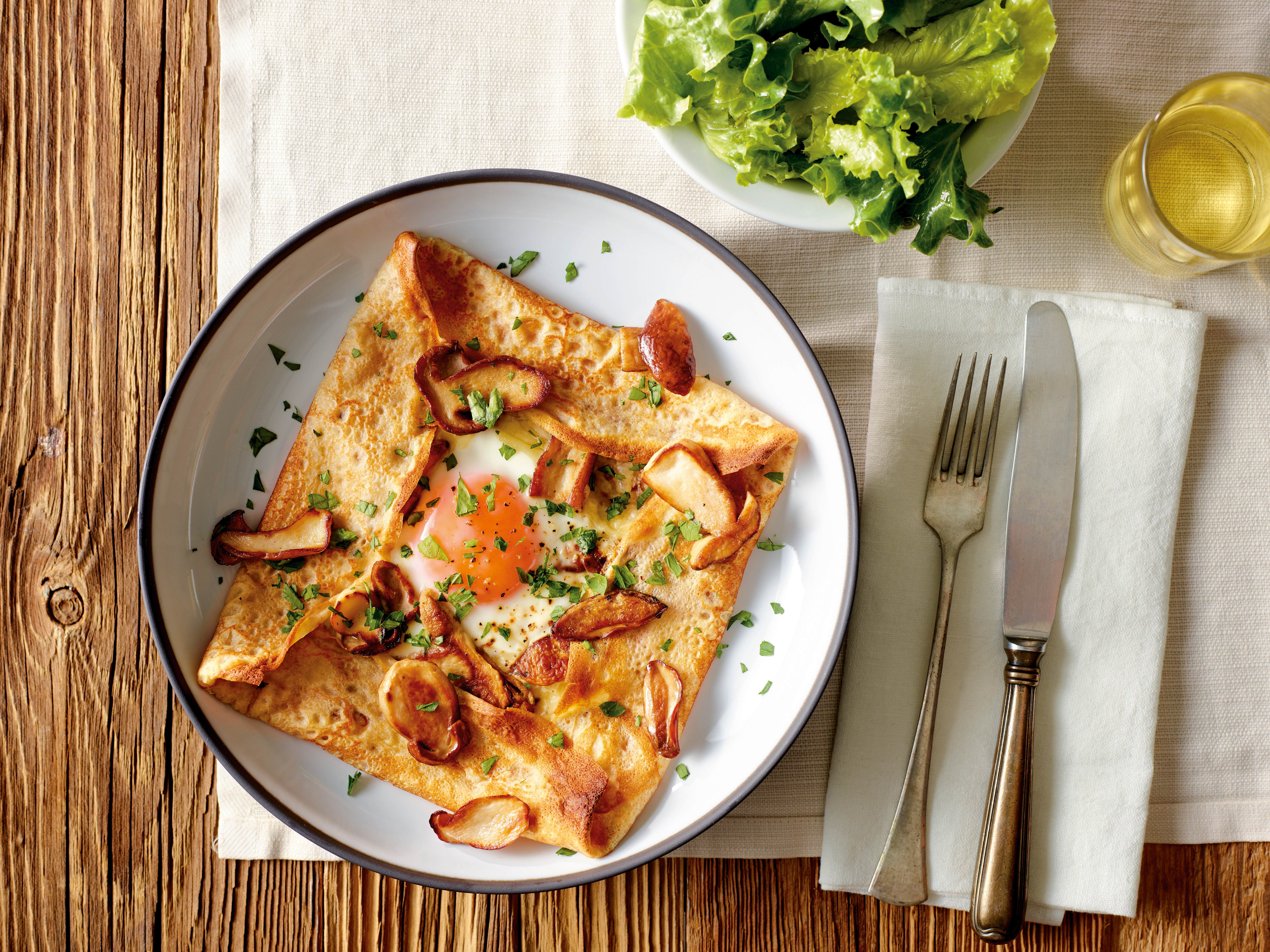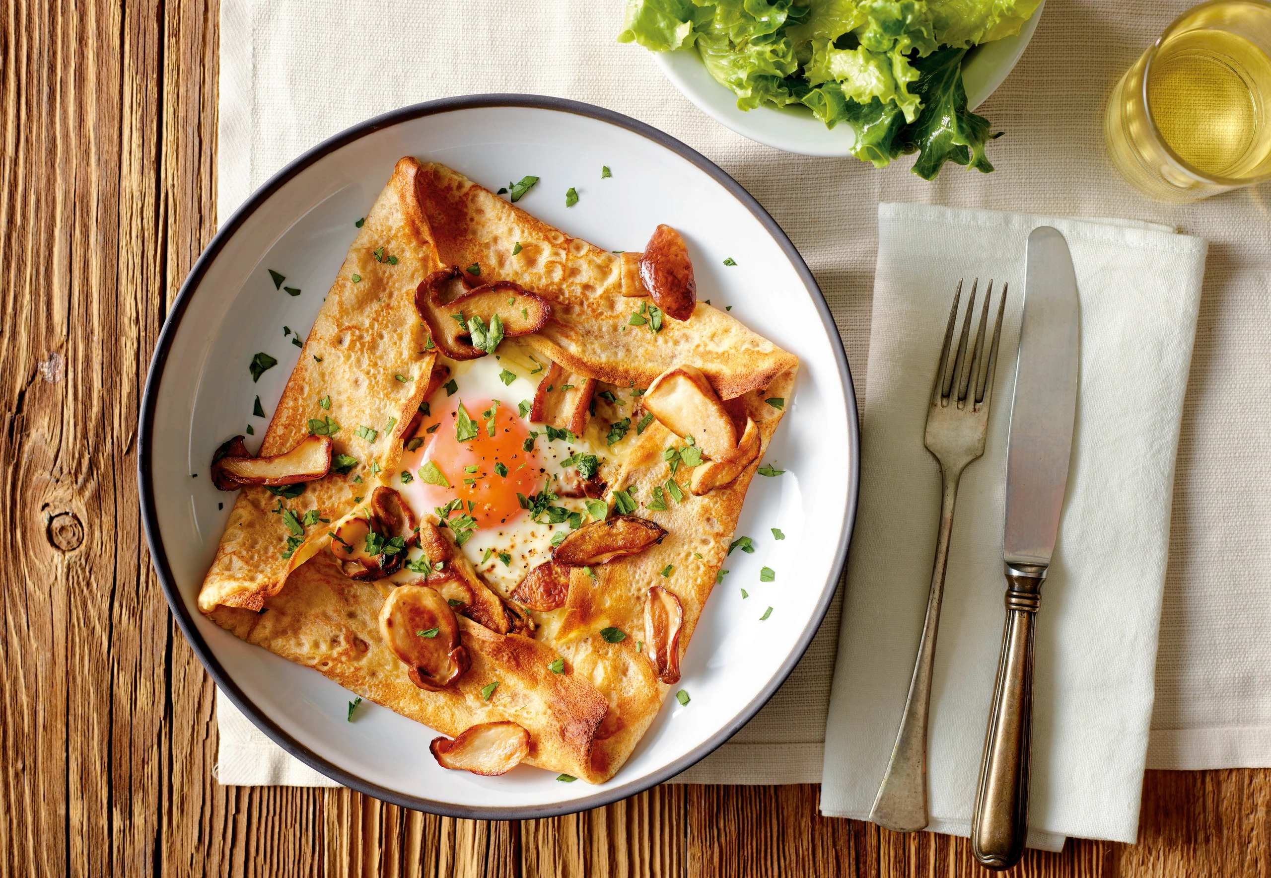 - Galettes auf das Backblech legen, Bergkäse und Steinpilze gleichmäßig darauf verteilen und je ein Ei in die Mitte schlagen. Eier salzen und pfeffern. Ränder umschlagen. Galettes im Rohr (mittlere Schiene) ca. 7 Minuten backen. Das Eiklar sollte weiß, der Dotter noch leicht flüssig sein. Galettes mit Petersilie bestreuen. Dazu passt grüner Salat.