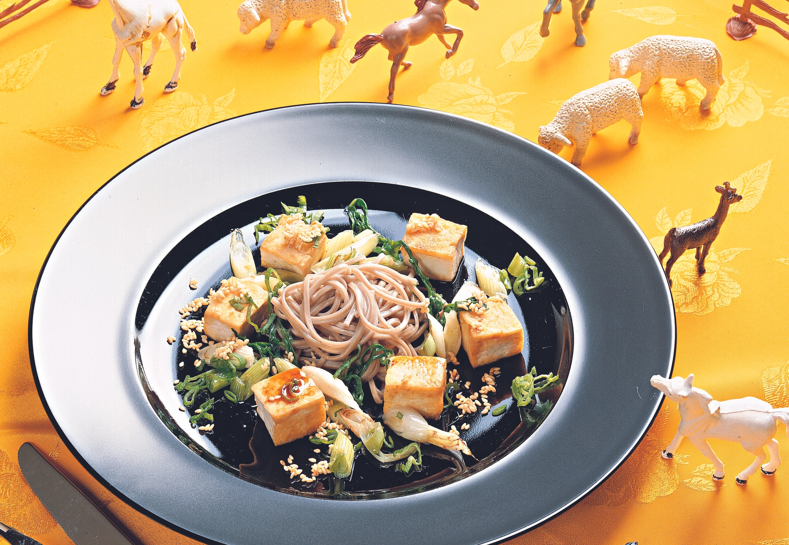 Nudeln in Gemüsesuppe erwärmen und mit Tofuwürfeln und Gemüse anrichten. Tofu mit 1 EL Sojasauce beträufeln. Die Nudeln mit Jungzwiebelringen und Sesam bestreuen.