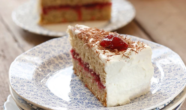 - Torte horizontal durchschneiden und mit der Marmelade füllen. Obers steif schlagen. Torte rundum mit Obers einstreichen, mit Schokospänen und Preiselbeermarmelade garnieren.