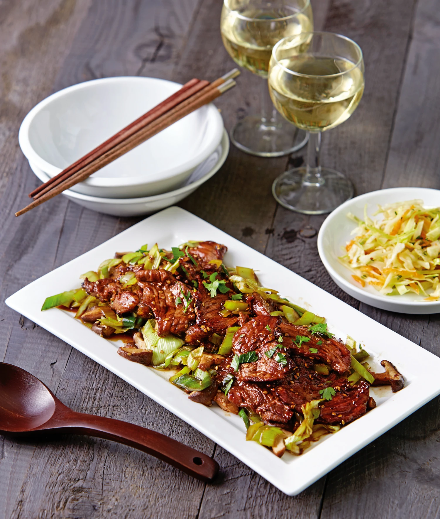 Fleisch mit der Marinade ohne Zugabe von Öl braten und umfüllen. Diesen Vorgang mit dem Gemüse wiederholen. Fleisch und Gemüse mischen, anrichten und mit dem Salat servieren.