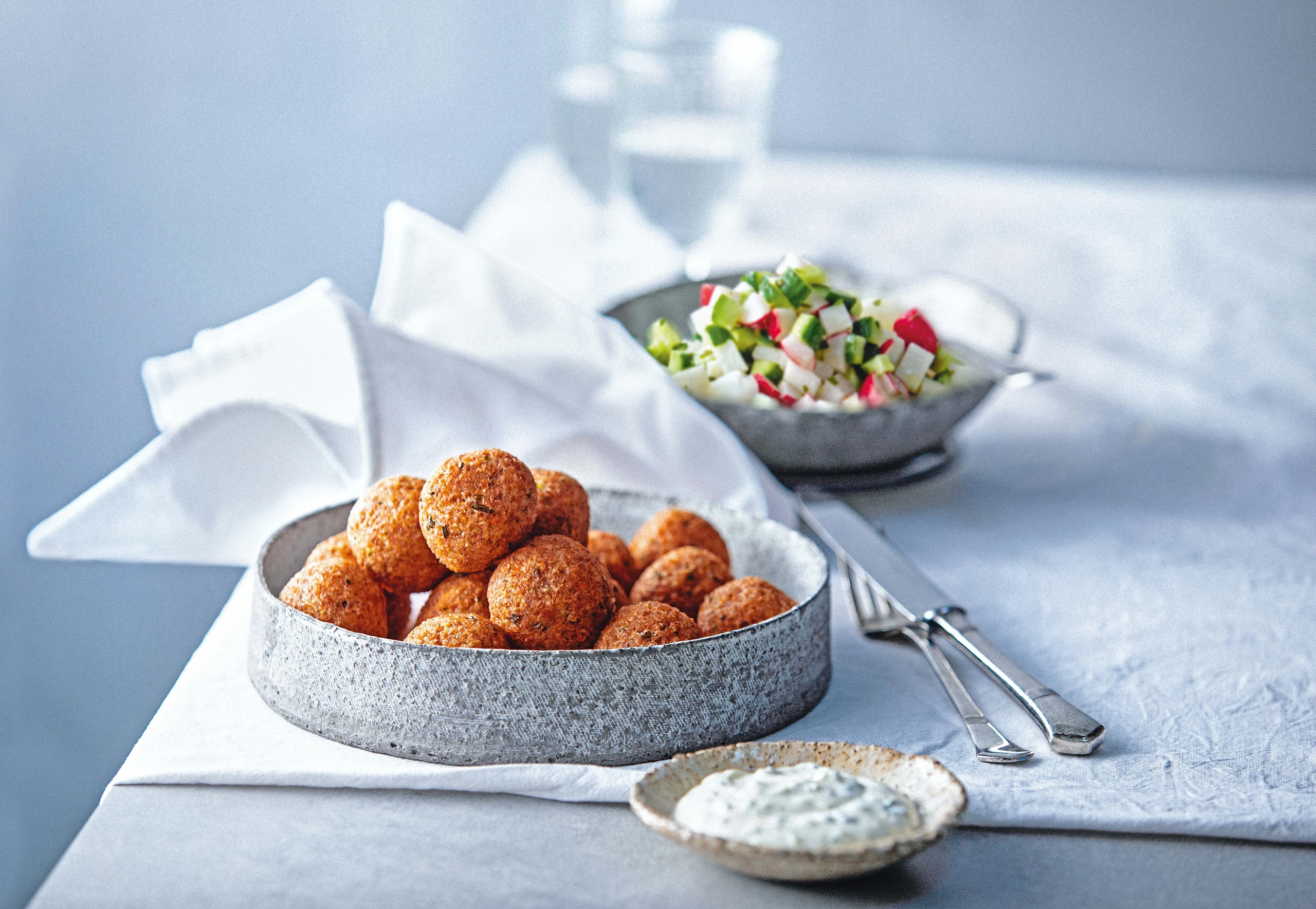 Bulgur-Bällchen mit Knoblauchdip und Gurken-Rettich-Radieschensalat