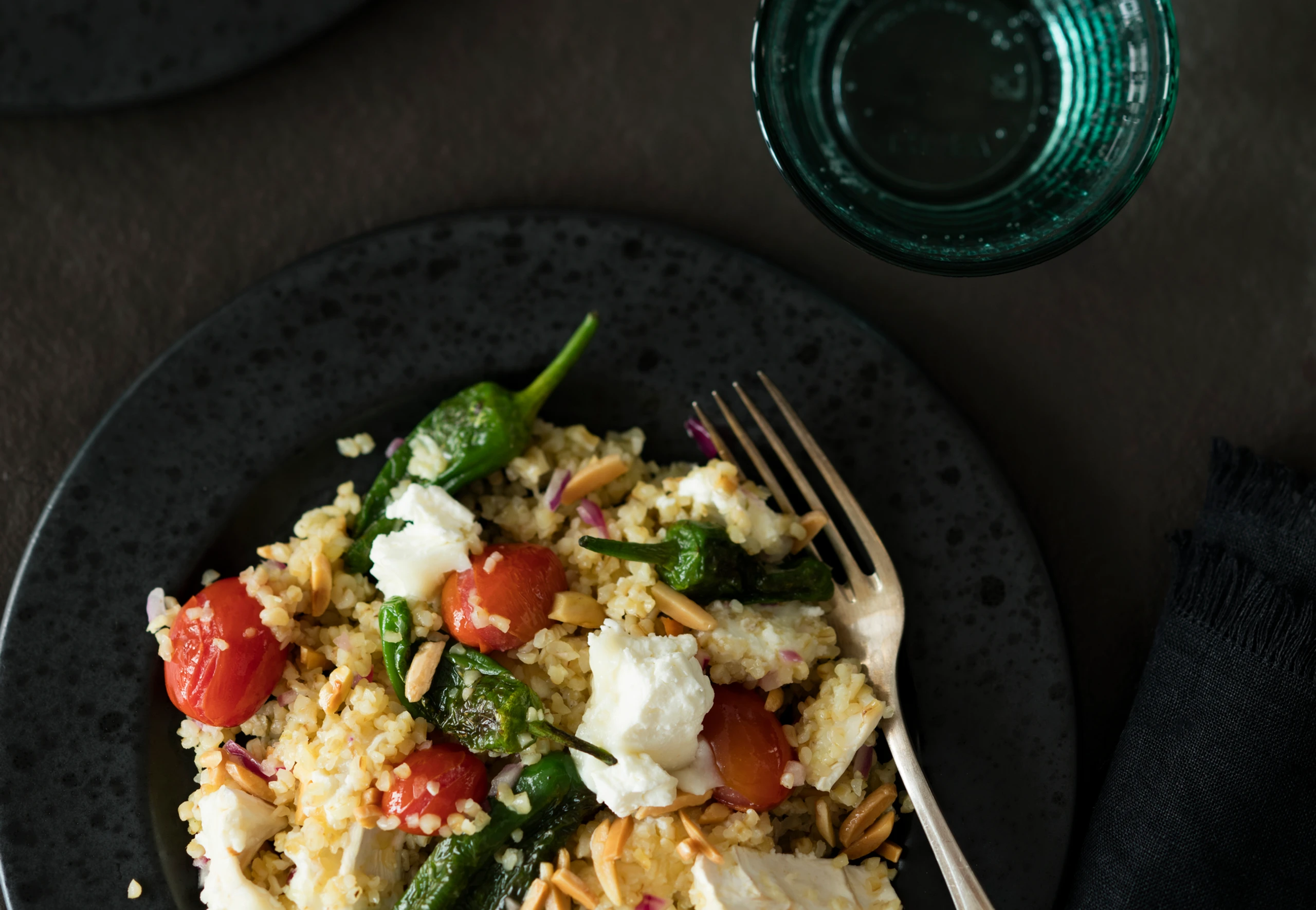 Bulgur mit Pimentos, Zwiebeln, Paradeisern, Chilis, Mandeln und Kräutern vermischen. Ziegenkäse untermengen. Bulgur anrichten.