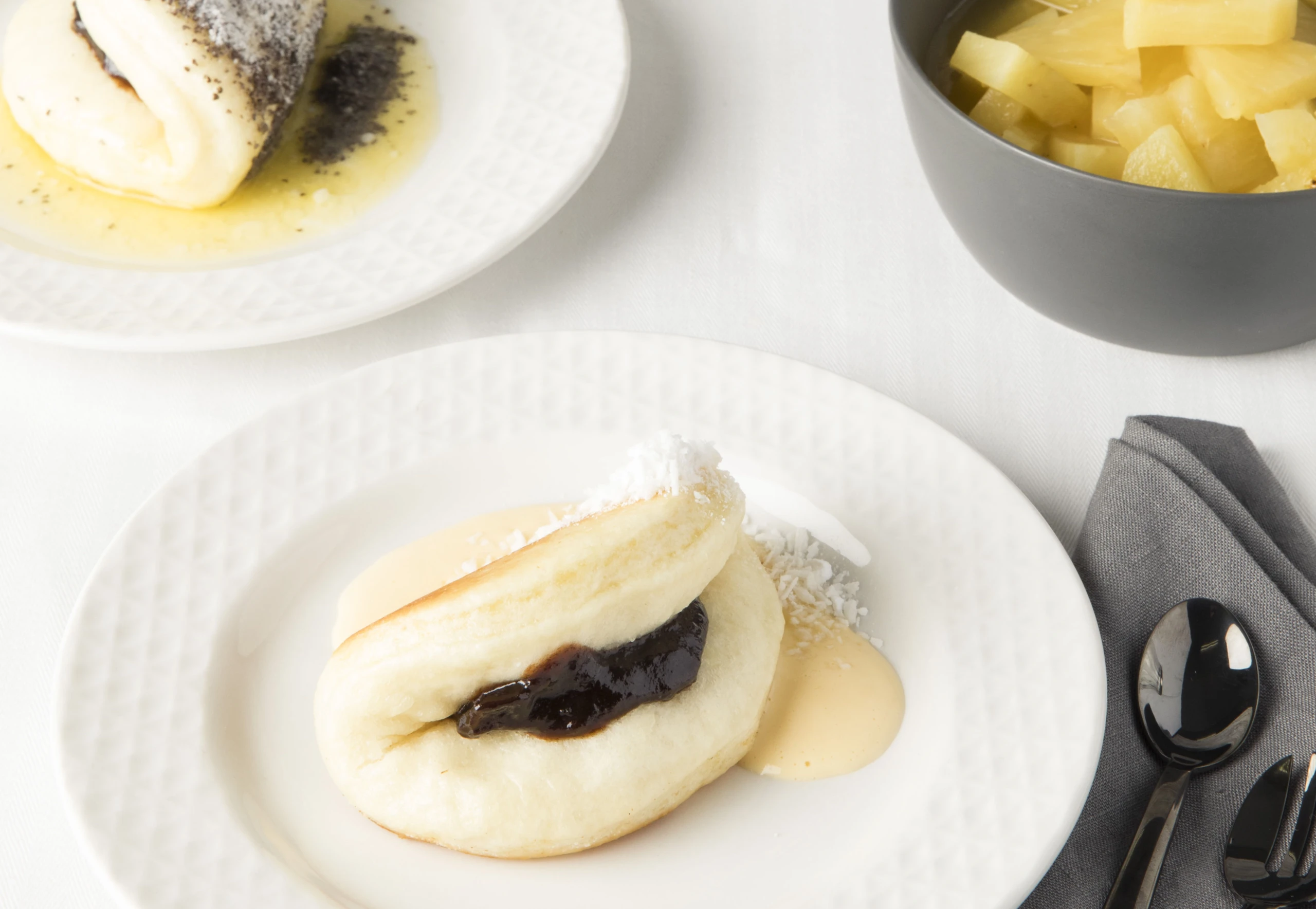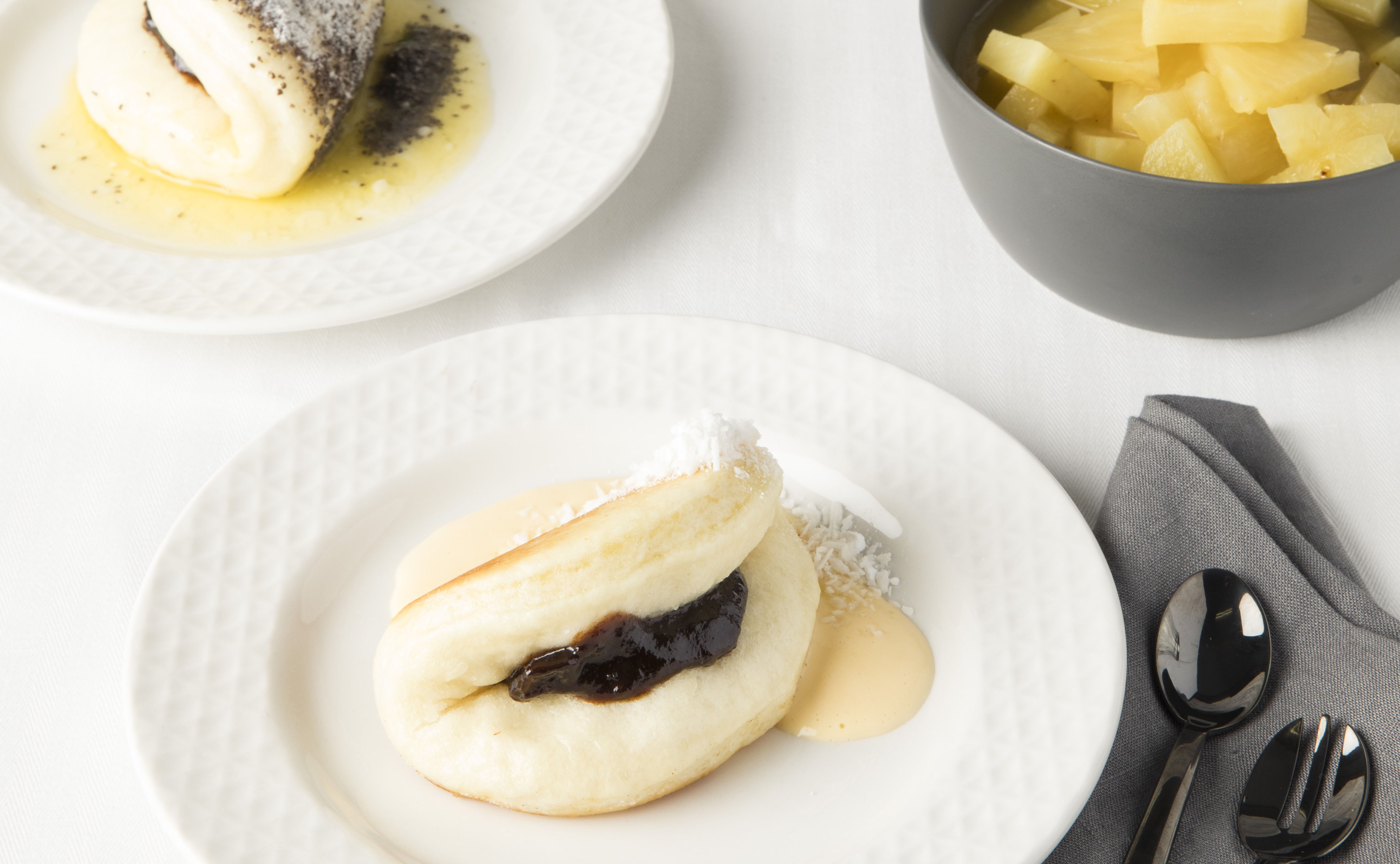 Acht Buns in wenig Öl beidseitig hell anbraten. Mit Powidl füllen, mit Kokosette bestreuen und mit der Sauce anrichten.