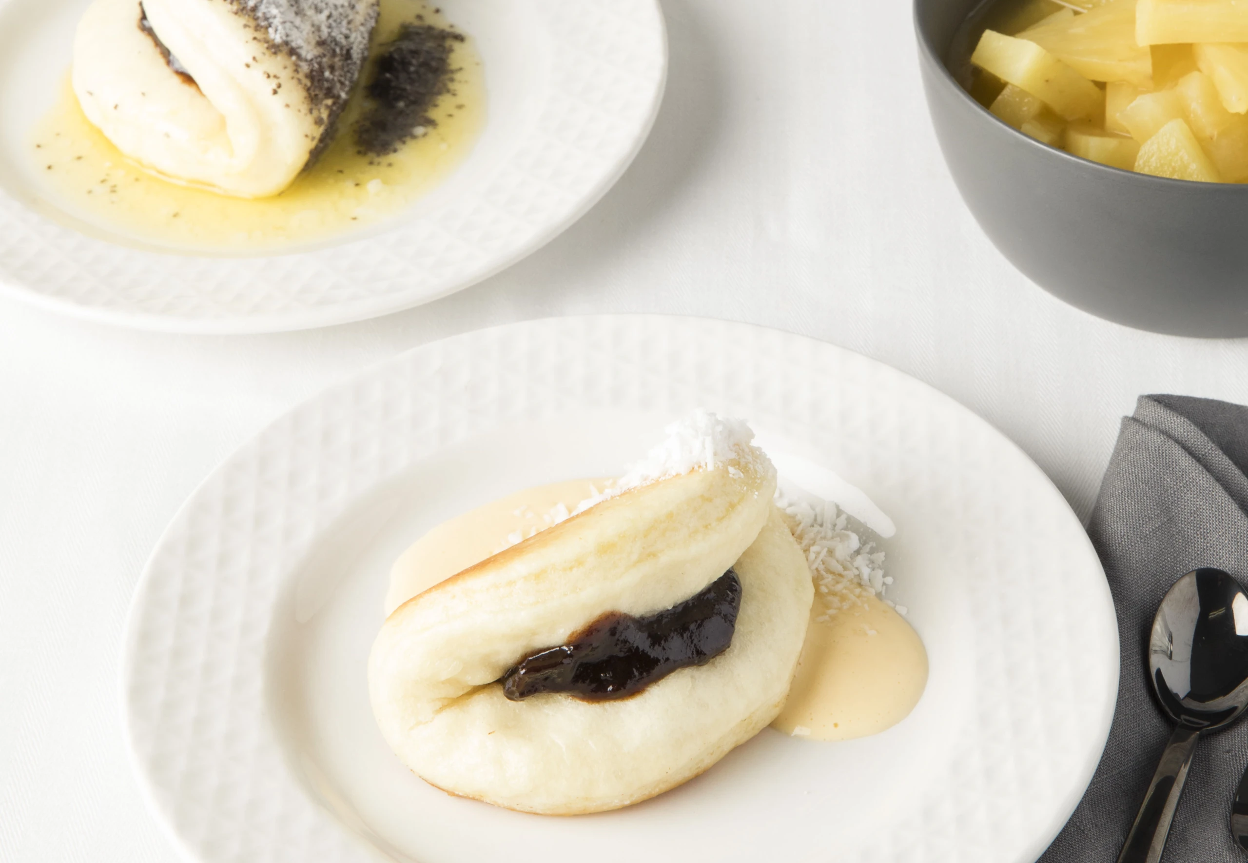 - Acht Buns in wenig Öl beidseitig hell anbraten. Mit Powidl füllen, mit Kokosette bestreuen und mit der Sauce anrichten.