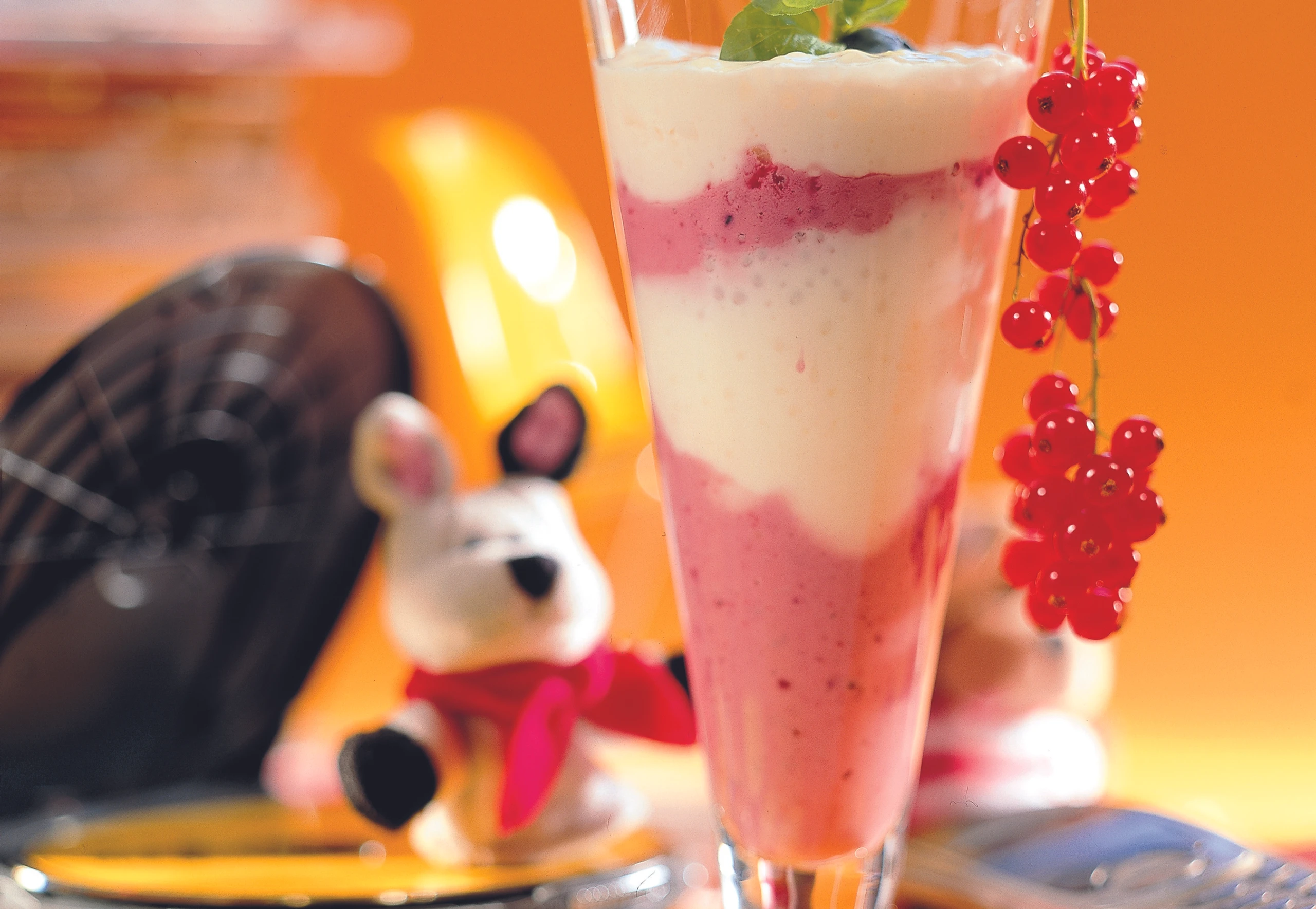 Beeren putzen, verlesen, kurz waschen und trocken tupfen. Mit Sauerrahm, der Hälfte von Zucker und Zitronensaft vermischen und mit einem Stabmixer fein pürieren. Joghurt mit übrigem Zucker und Zitronensaft vermischen und mit einem Stabmixer aufschlagen. Beide Mischungen ca. 1 Stunde kühlen.