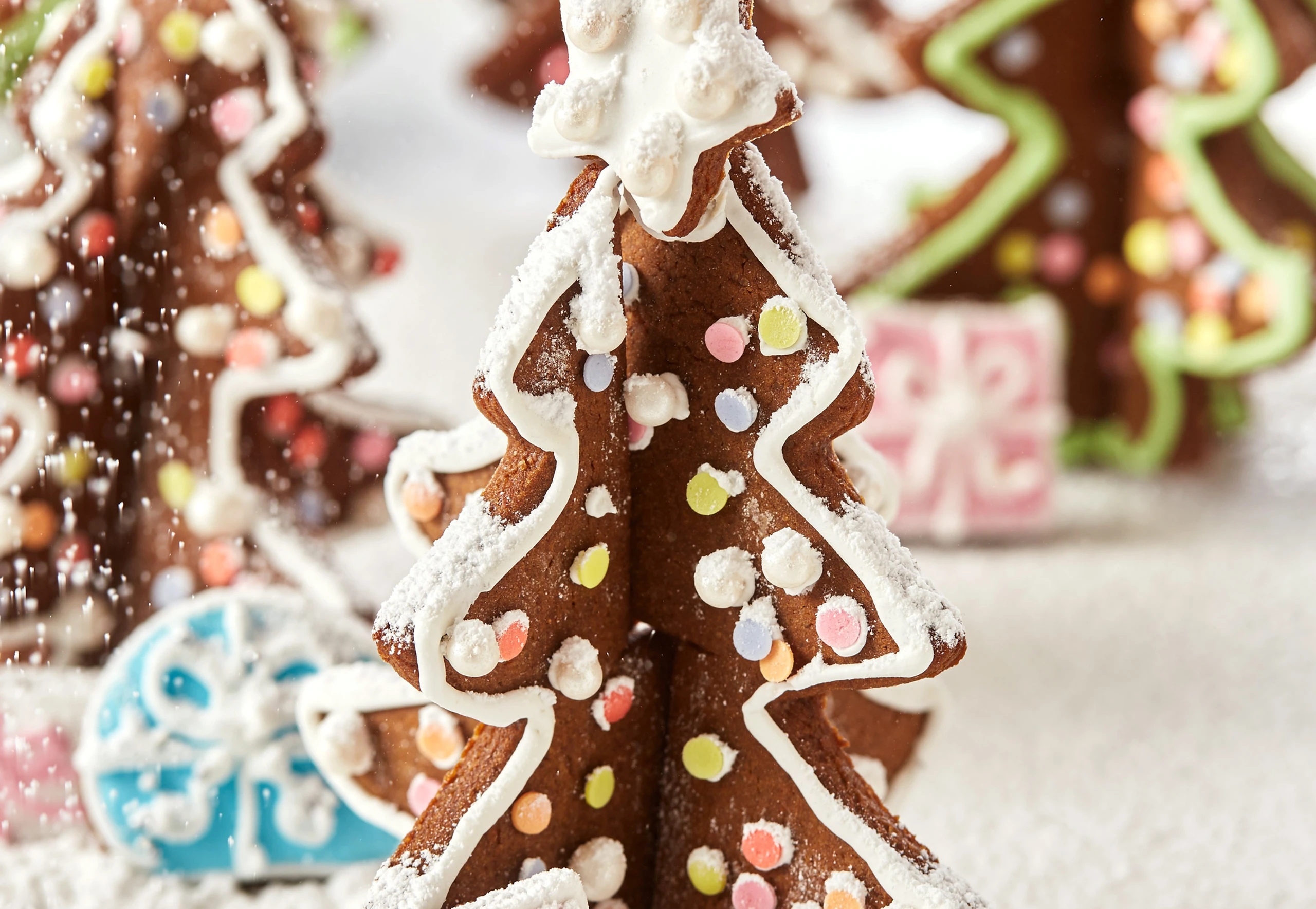 Für die Glasur alle Zutaten mit dem Mixer ca. 5 Minuten steif schlagen. Glasur mit Lebensmittelfarbe einfärben, in Stanitzel füllen, Kekse damit verzieren und mit Streudekor dekorieren. Glasur trocknen lassen. Die Bäumchen ineinander stecken.