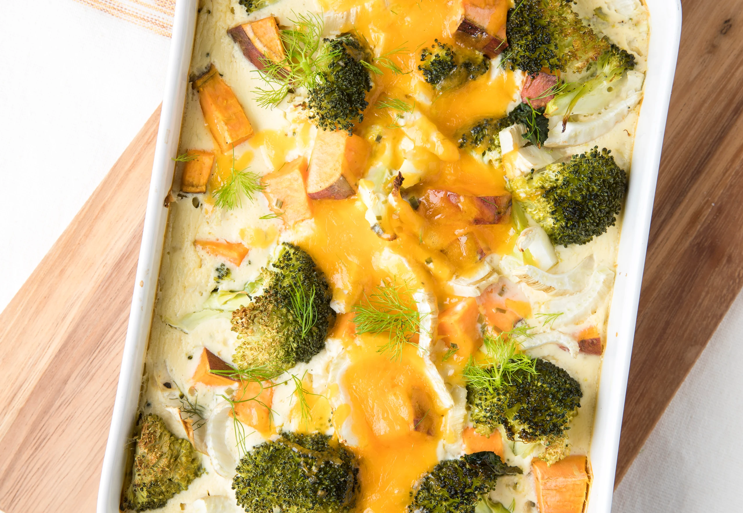 Rohr auf 180°C vorheizen. Süßkartoffel unter kaltem Wasser abbürsten und in kleine Würfel schneiden. Brokkoli in kleine Stücke schneiden. Fenchelgrün abzupfen und beiseite legen. Fenchel feinblättrig schneiden. Gemüse in eine Auflaufform schichten und den Guss darauf verteilen. Cheddar reiben und darüber streuen.