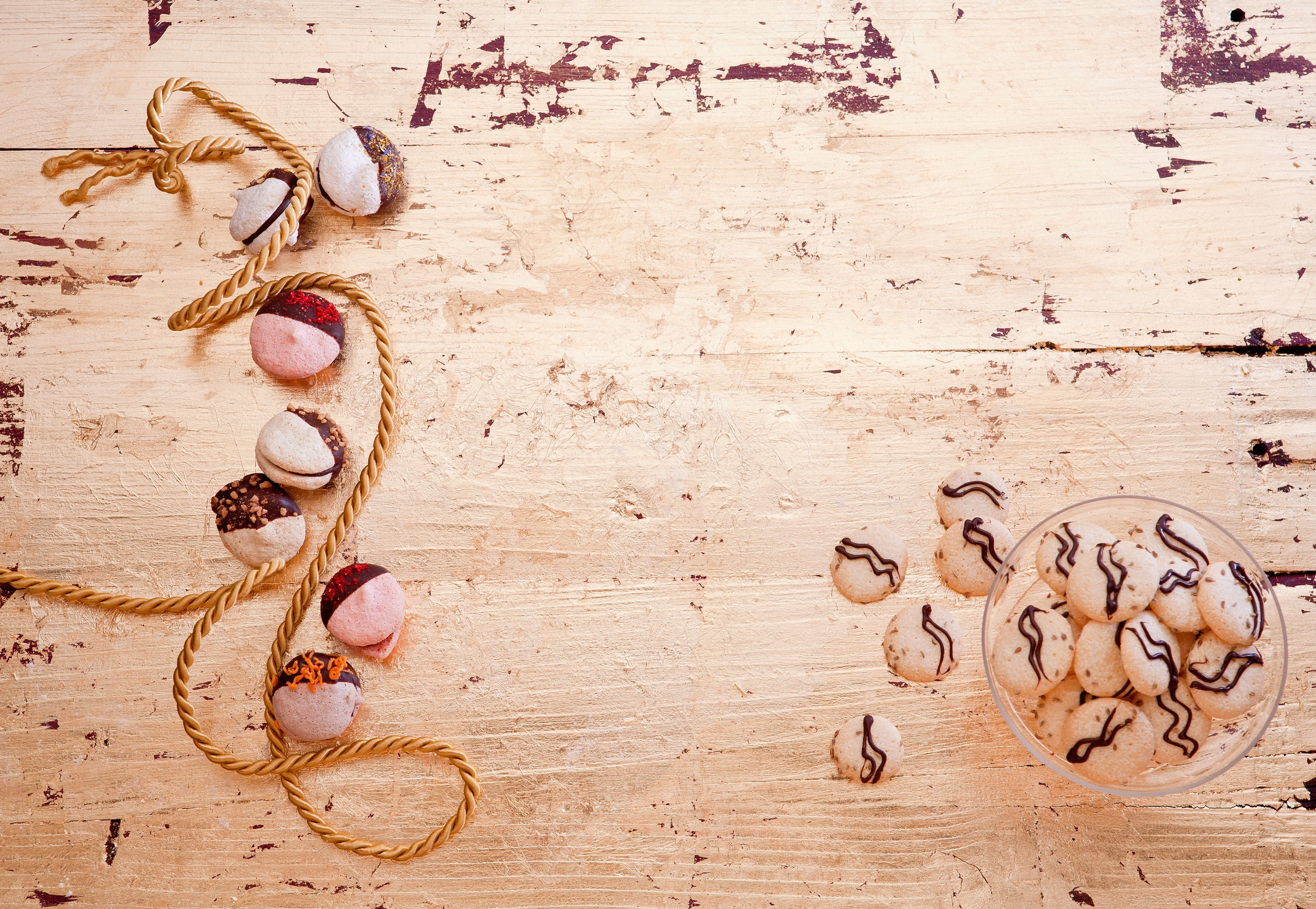 Jede Masse in einen Dressiersack mit Lochtülle (Ø 5 mm) füllen. Tupfer (Ø ca. 2 cm) auf die Bleche dressieren und bei Zimmertemperatur 1 Stunde trocknen lassen.
