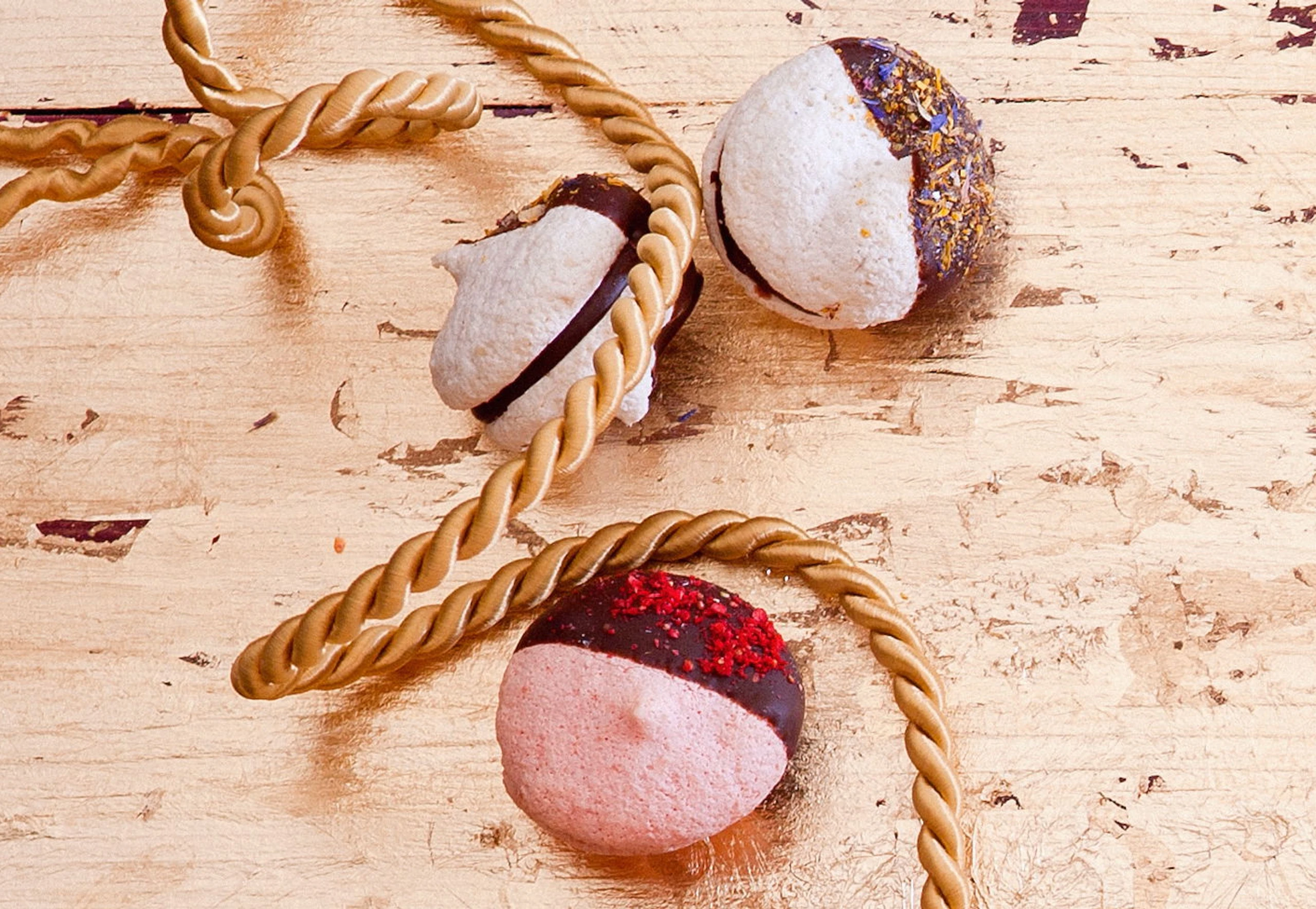 Fülle in einen Dressiersack mit Lochtülle (Ø 5 mm) füllen. Jeweils 2 Makarons mit einem Tupfer Creme zusammensetzen und zur Hälfte in Bitterschokolade tunken. Makarons mit Krokant, Erdbeeren, Schokolade und Blüten garnieren.